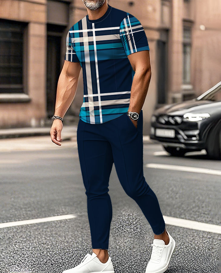 This men's casual two-piece set is the perfect combination of comfort and style, designed for the warmer seasons of spring and summer. Made from a high-quality blend of 100% cotton and polyester, the fabric ensures a soft feel while being breathable and durable for all-day wear. Featuring a bold geometric print, this set offers a unique, modern look that stands out in any casual or sporty setting. The round-neck design and short sleeves provide a relaxed and comfortable fit, ideal for various occasions like casual outings, sports, or weekend get-togethers.