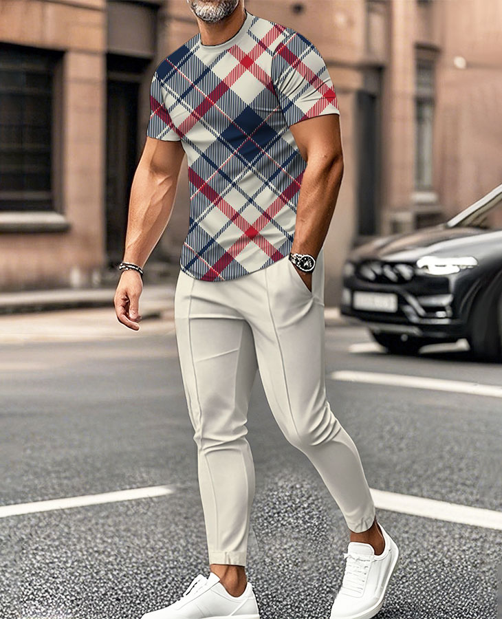 This men's casual two-piece set is the perfect combination of comfort and style, designed for the warmer seasons of spring and summer. Made from a high-quality blend of 100% cotton and polyester, the fabric ensures a soft feel while being breathable and durable for all-day wear. Featuring a bold geometric print, this set offers a unique, modern look that stands out in any casual or sporty setting. The round-neck design and short sleeves provide a relaxed and comfortable fit, ideal for various occasions like casual outings, sports, or weekend get-togethers.
