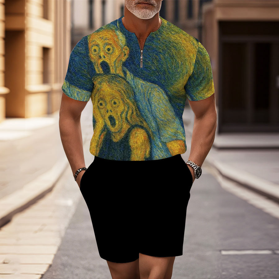 Men's Fashion Casual Round-Neck Geometric Printed Short-Sleeved Two-Piece Set