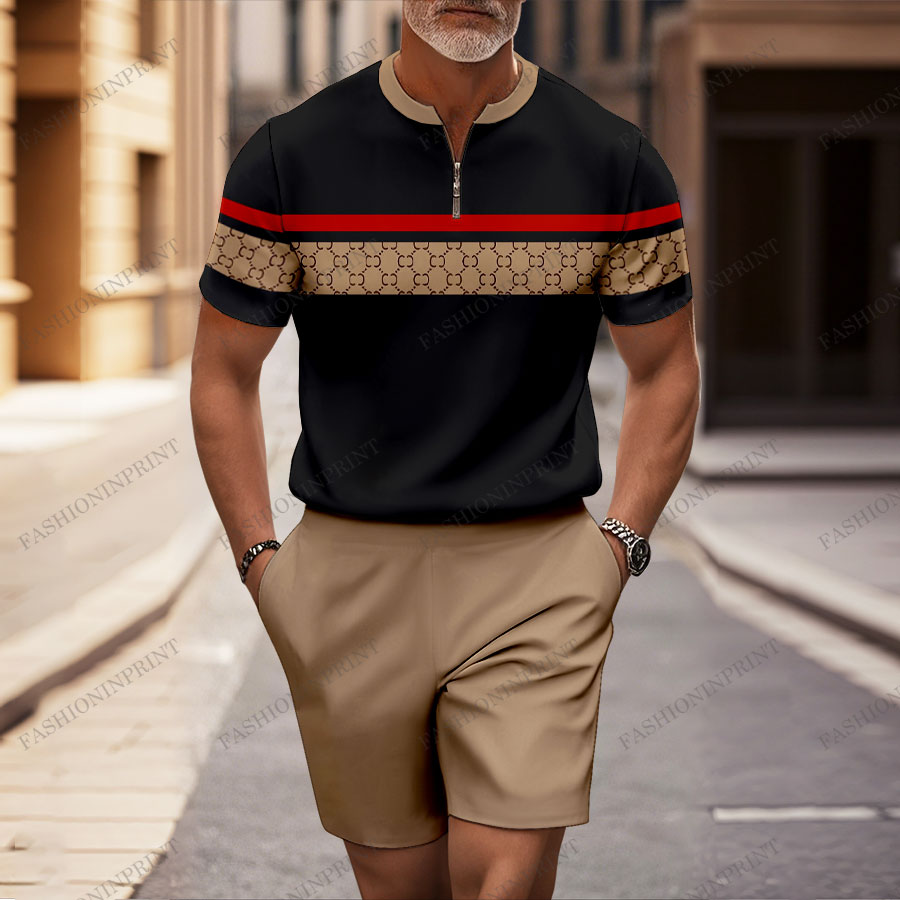 Men's Fashion Casual Black & Brown Color Matching Retro Checkered Striped Printed Round-Neck Zipper Short-Sleeved T-shirt & Shorts Two-Piece Set