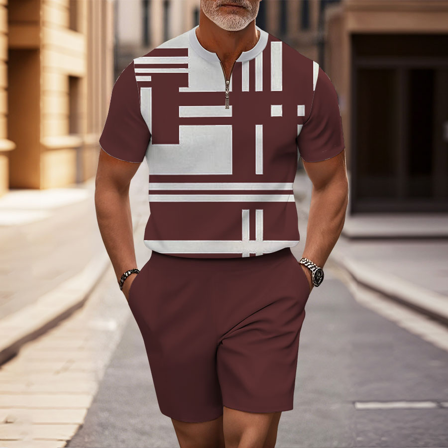 Men's Fashion Casual Round-Neck Zipper Geometric Printed Short-Sleeved Two-Piece Set