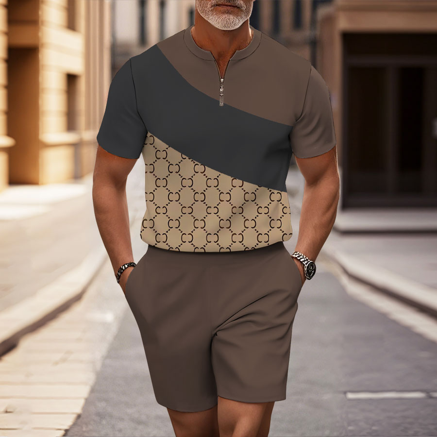 Men's Fashion Coffee & Khaki Color Matching Asymmetric Vintage Partten Casual Round-Neck Zipper Short-Sleeved Two-Piece Set