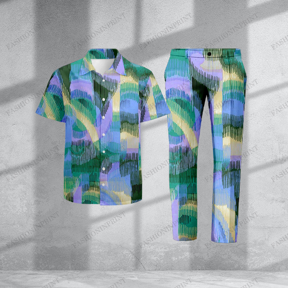 Men's Fashionable Color-Blocked Blue & Green Patterned Short-Sleeved Shirt And Trousers Two-Piece Set
