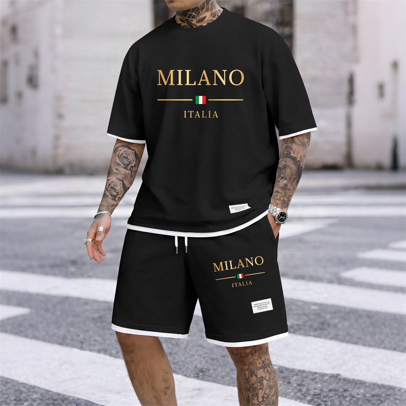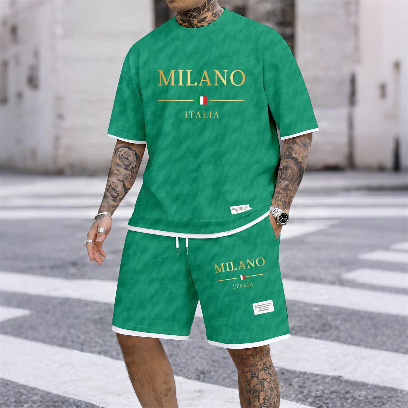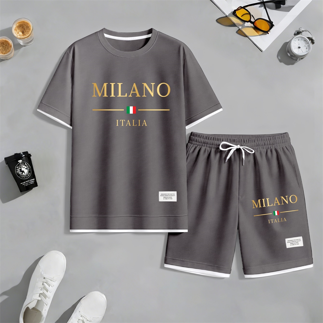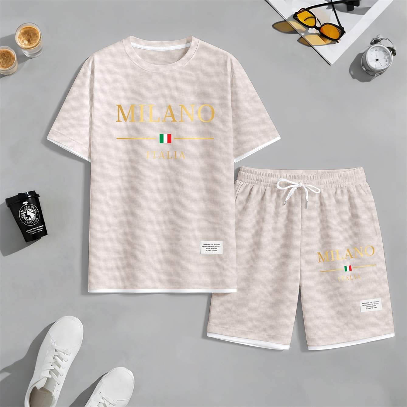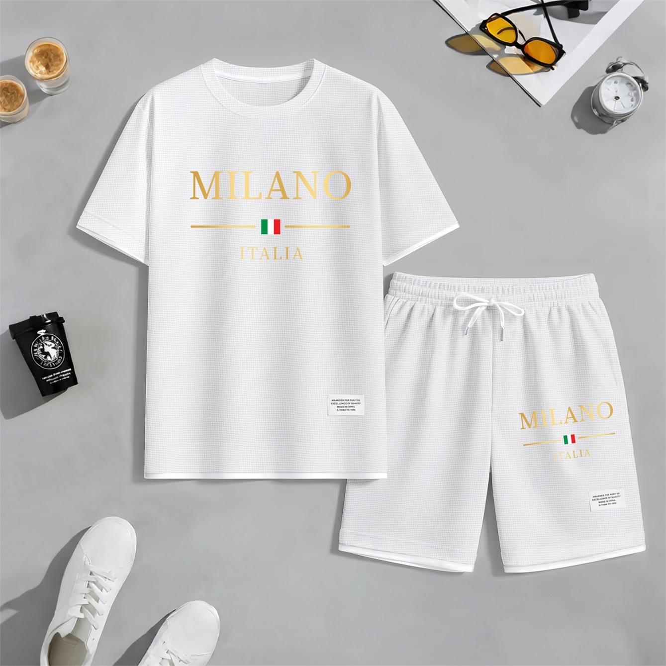 Men's Golden Milano Italy Print Waffle Fabric Short-Sleeved Shirt And Shorts Set02