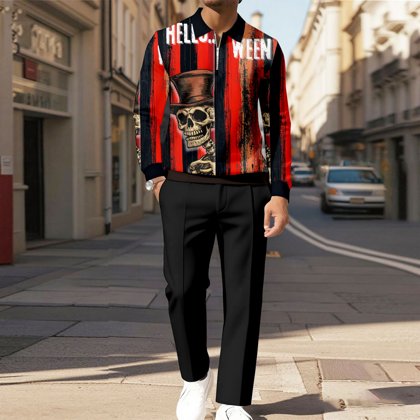 Men's Halloween Color Matching Printed Polo-Collar Zipper Long Sleeved Trousers Two-Piece Set