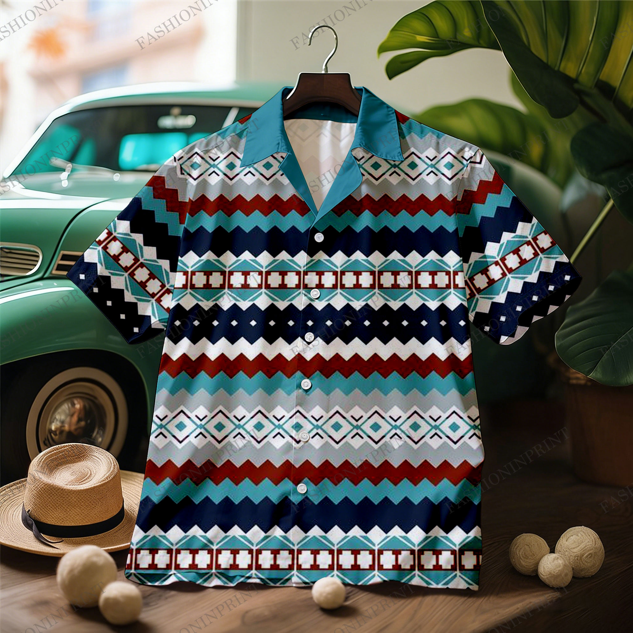 Men's Hawaii Casual Gray & Green Color Matching Ethnic Style Print Short-Sleeve Shirt