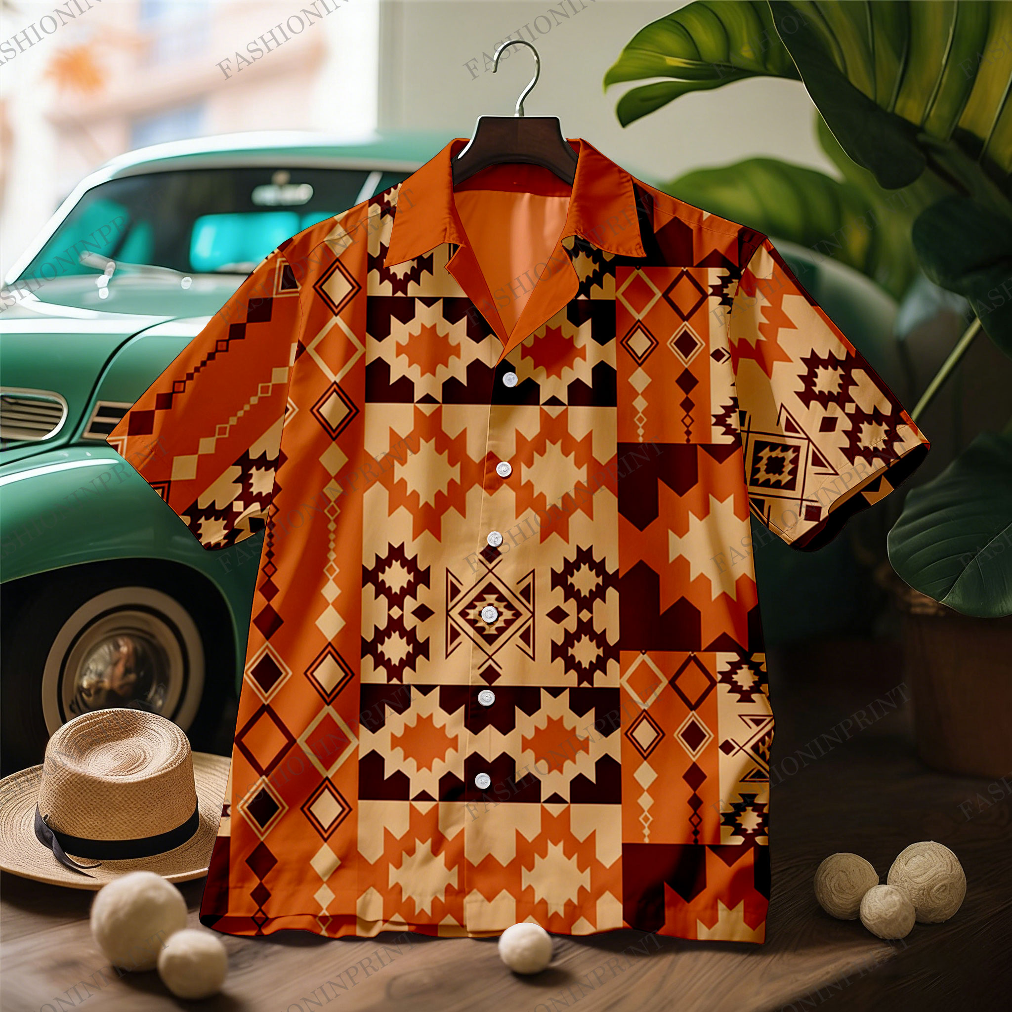 Men's Hawaii Casual Red Orange Color Matching Ethnic Style Print Short-Sleeve Shirt