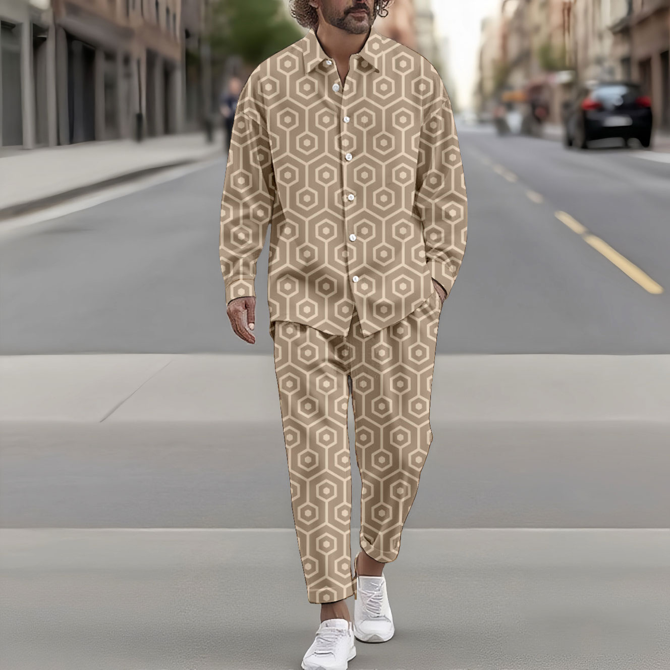 Men's Lapel Beige & Khaki Color Matching Vintage Pattern Long Sleeved Shirts & Casual Pants Two-Piece Set