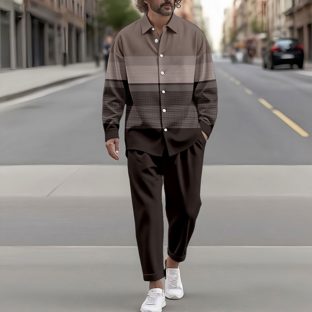 Men's Lapel Coffee & Khaki Color Matching Striped Printed Long Sleeved Shirts & Casual Pants Two-Piece Set