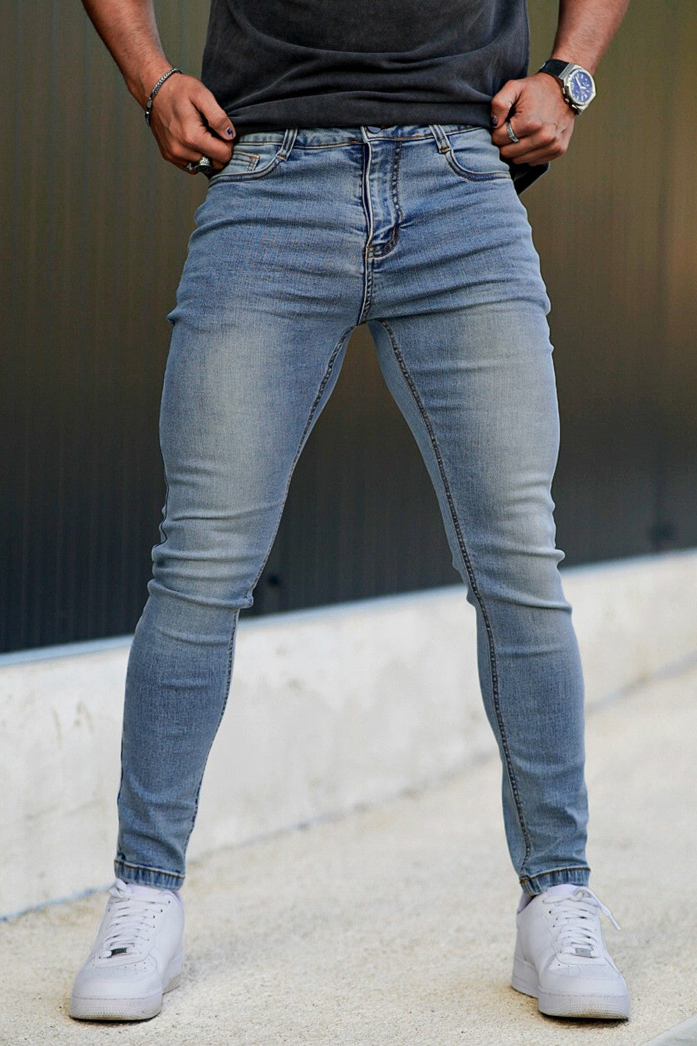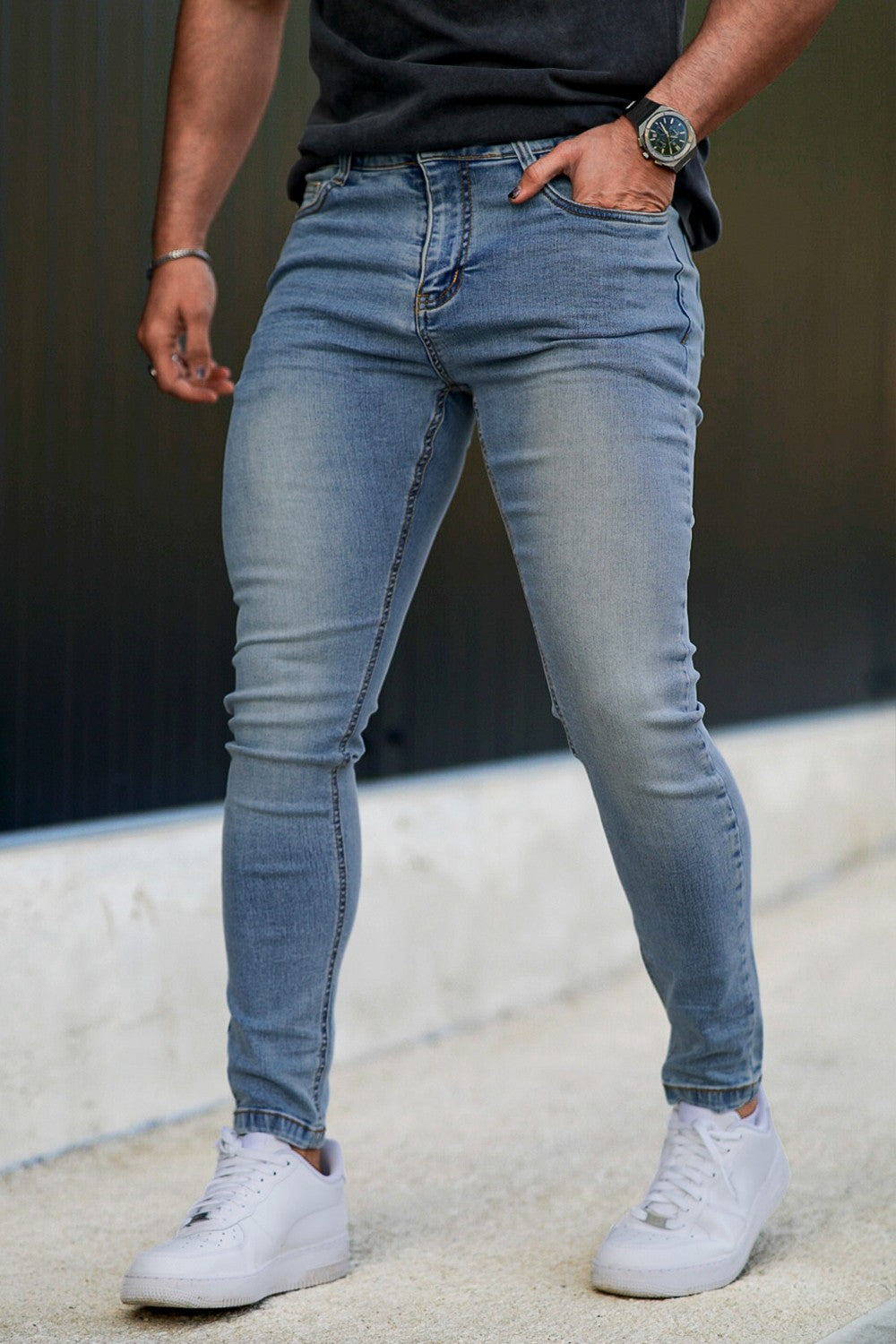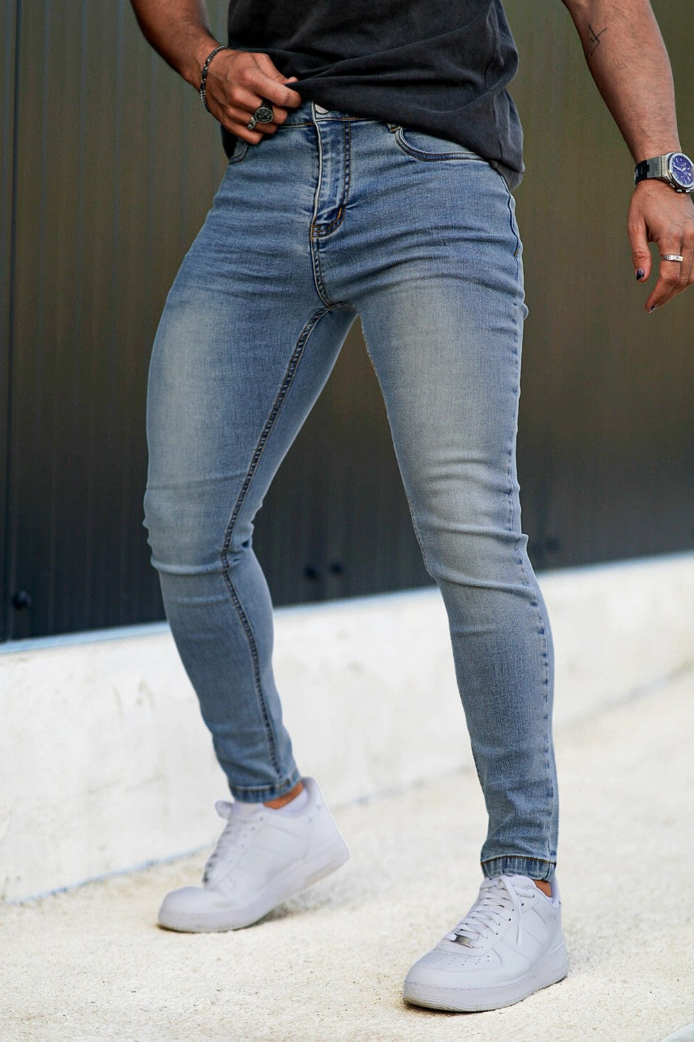 Super comfortable and high-stretch denim jeans designed with a form-flattering, muscular thighs fit. Our light wash skinny jeans fit your lower body to wear all day long and can be paired with our popular basic tops.