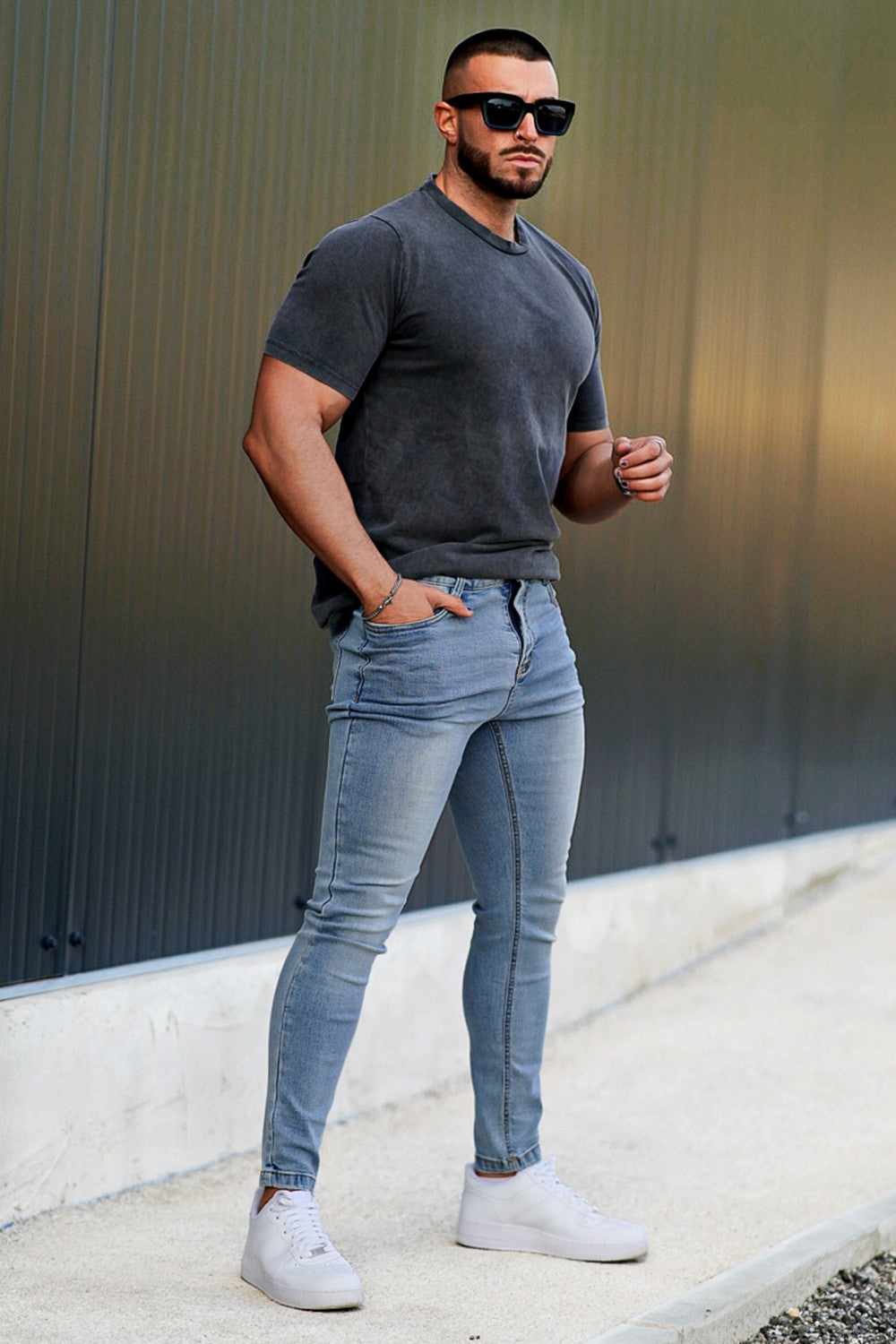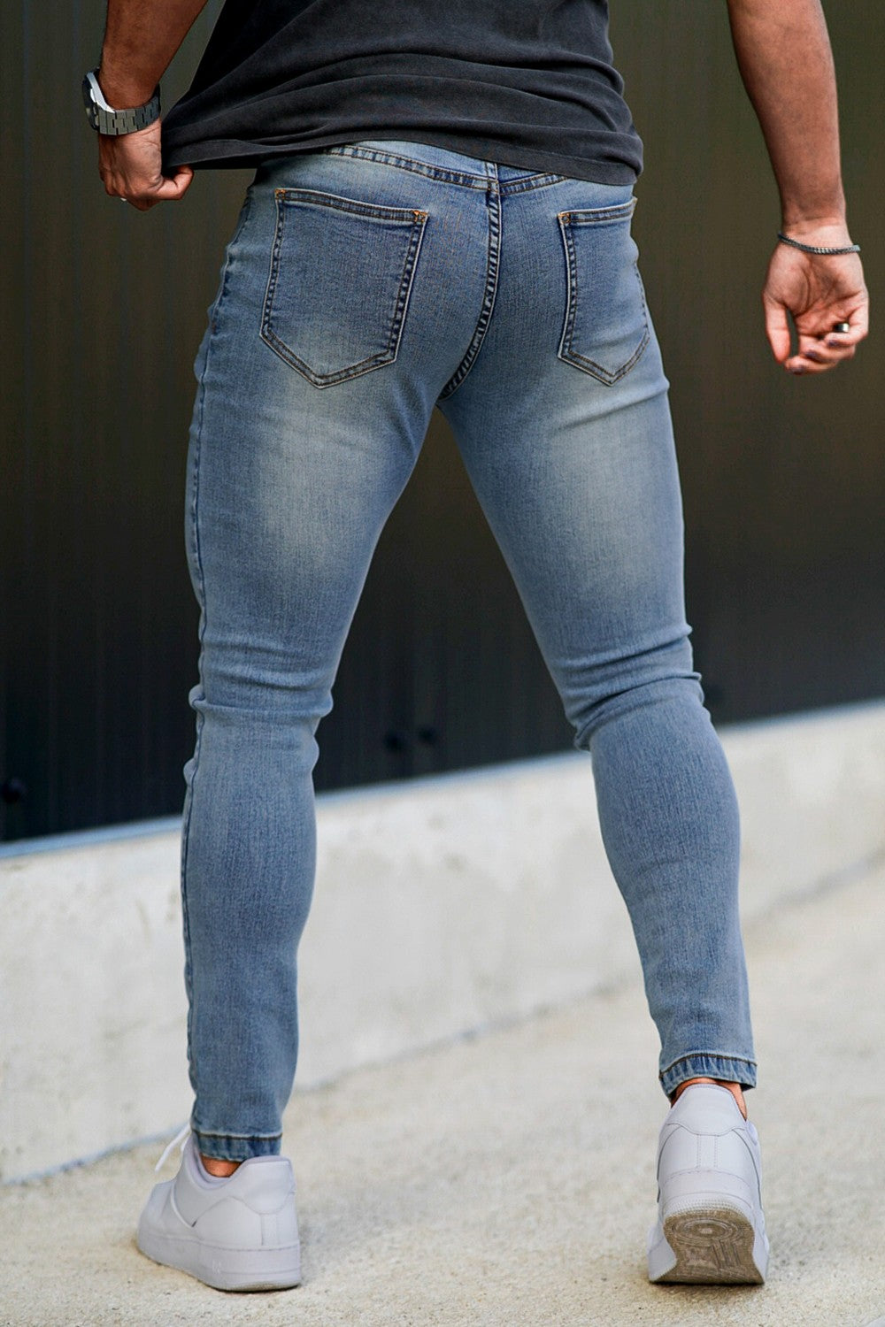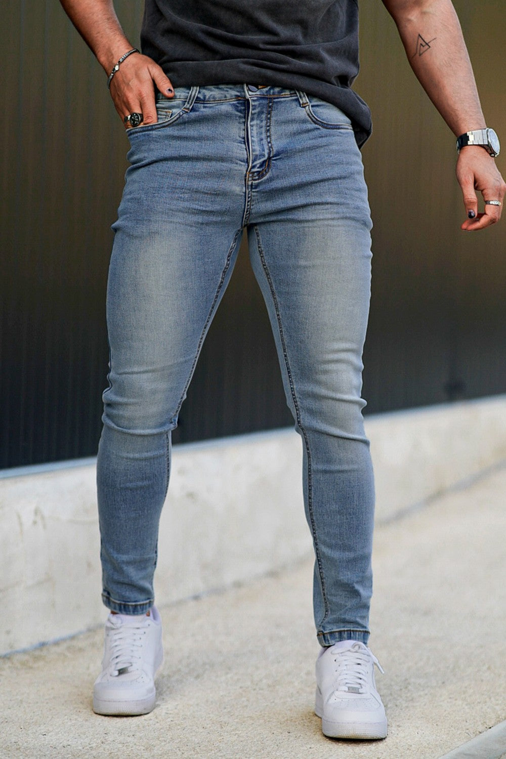 Super comfortable and high-stretch denim jeans designed with a form-flattering, muscular thighs fit. Our light wash skinny jeans fit your lower body to wear all day long and can be paired with our popular basic tops.