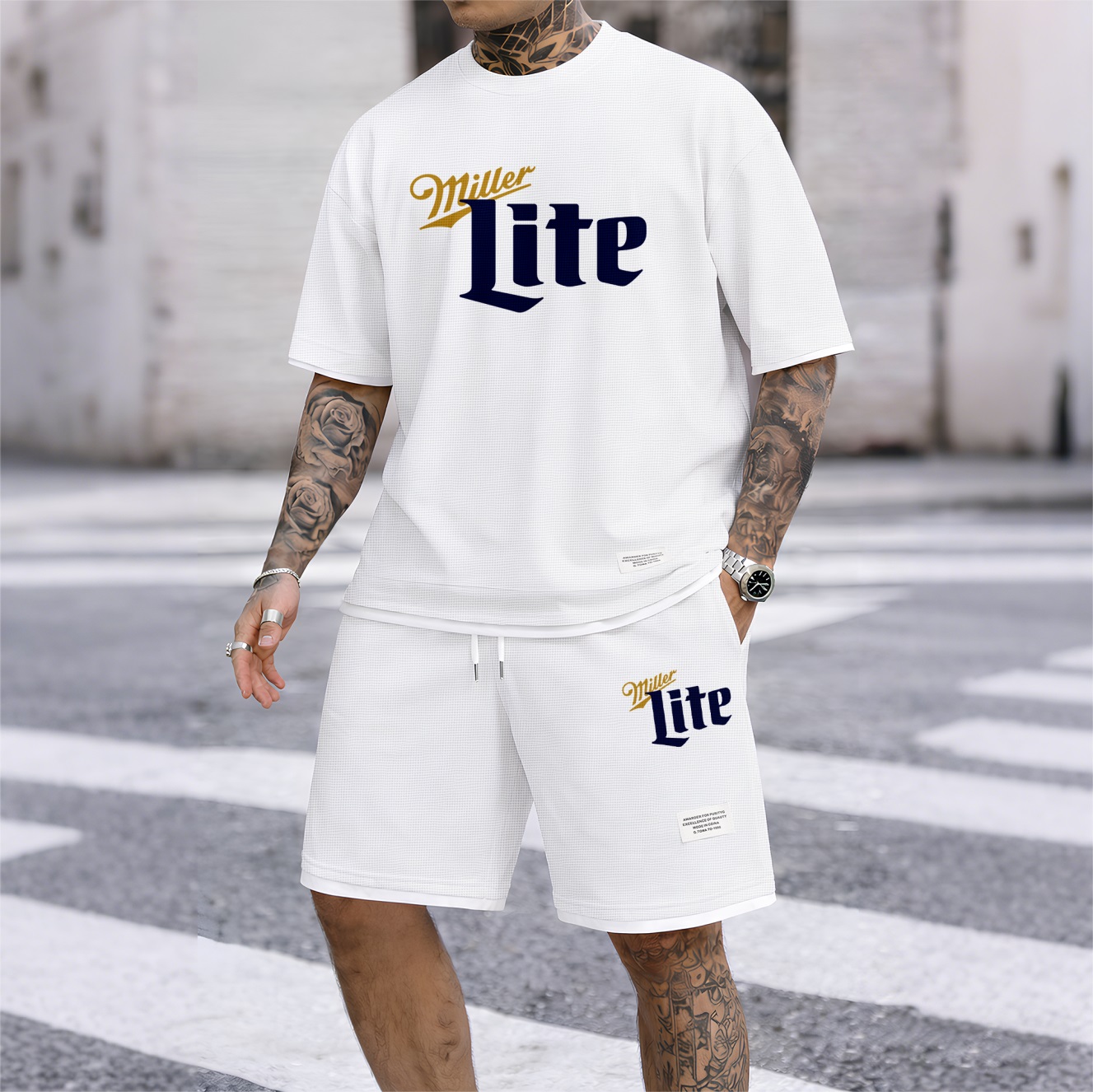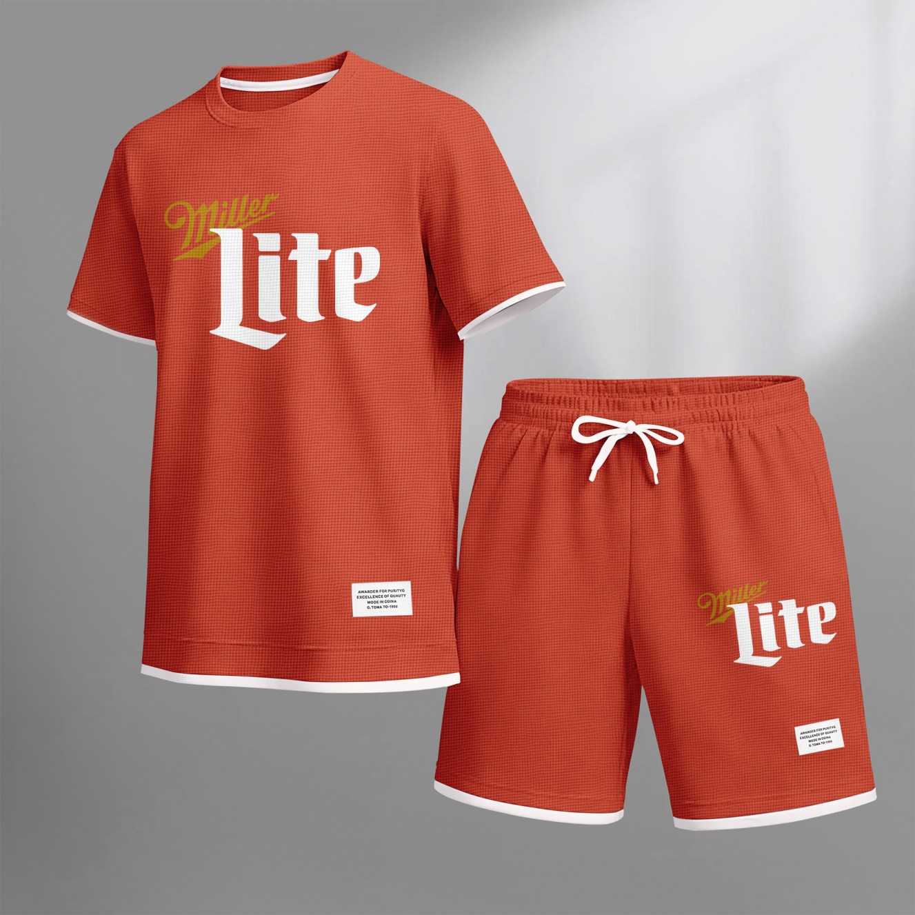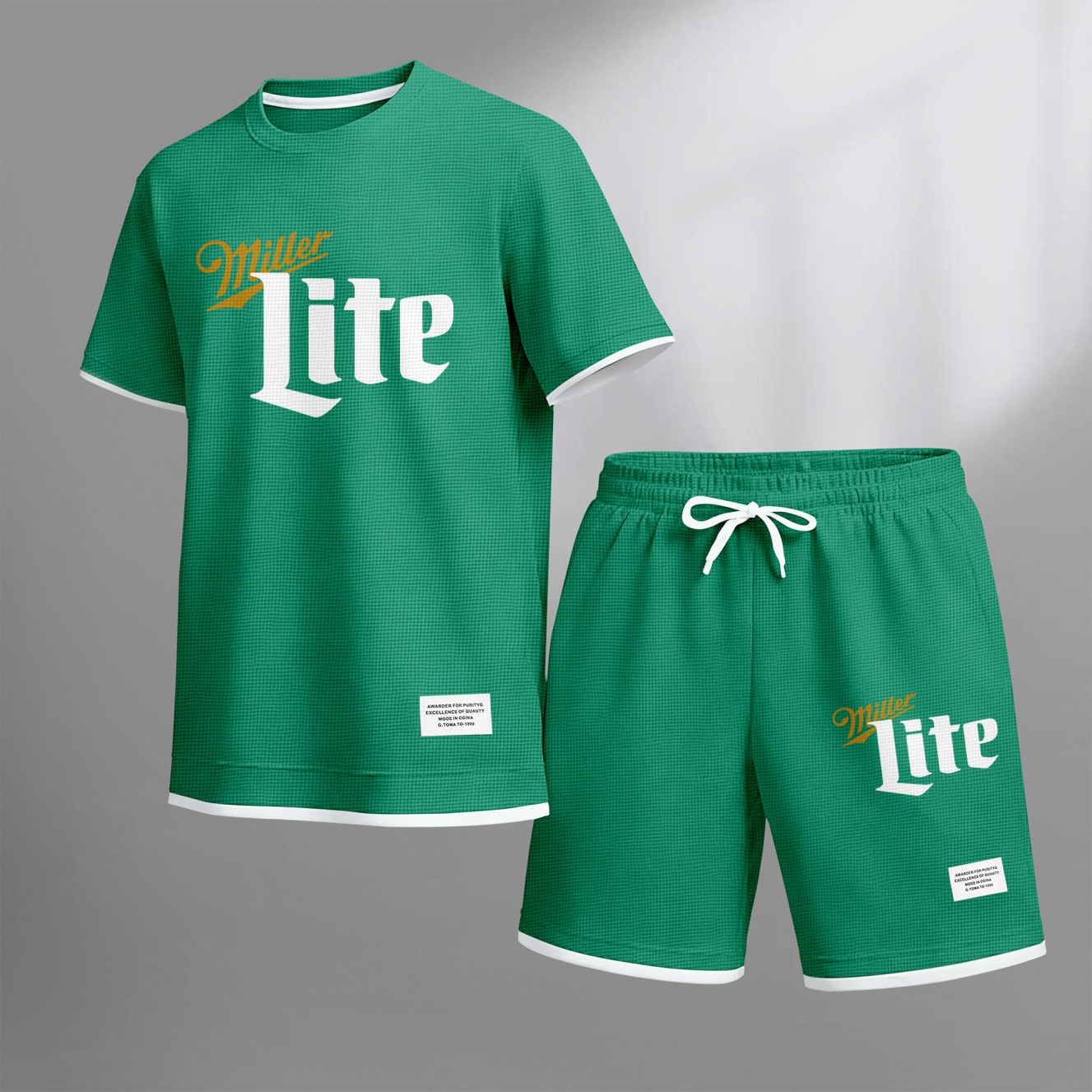 Men's Low-Calorie Beer Print Waffle Fabric Short-Sleeved Shirt And Shorts Set