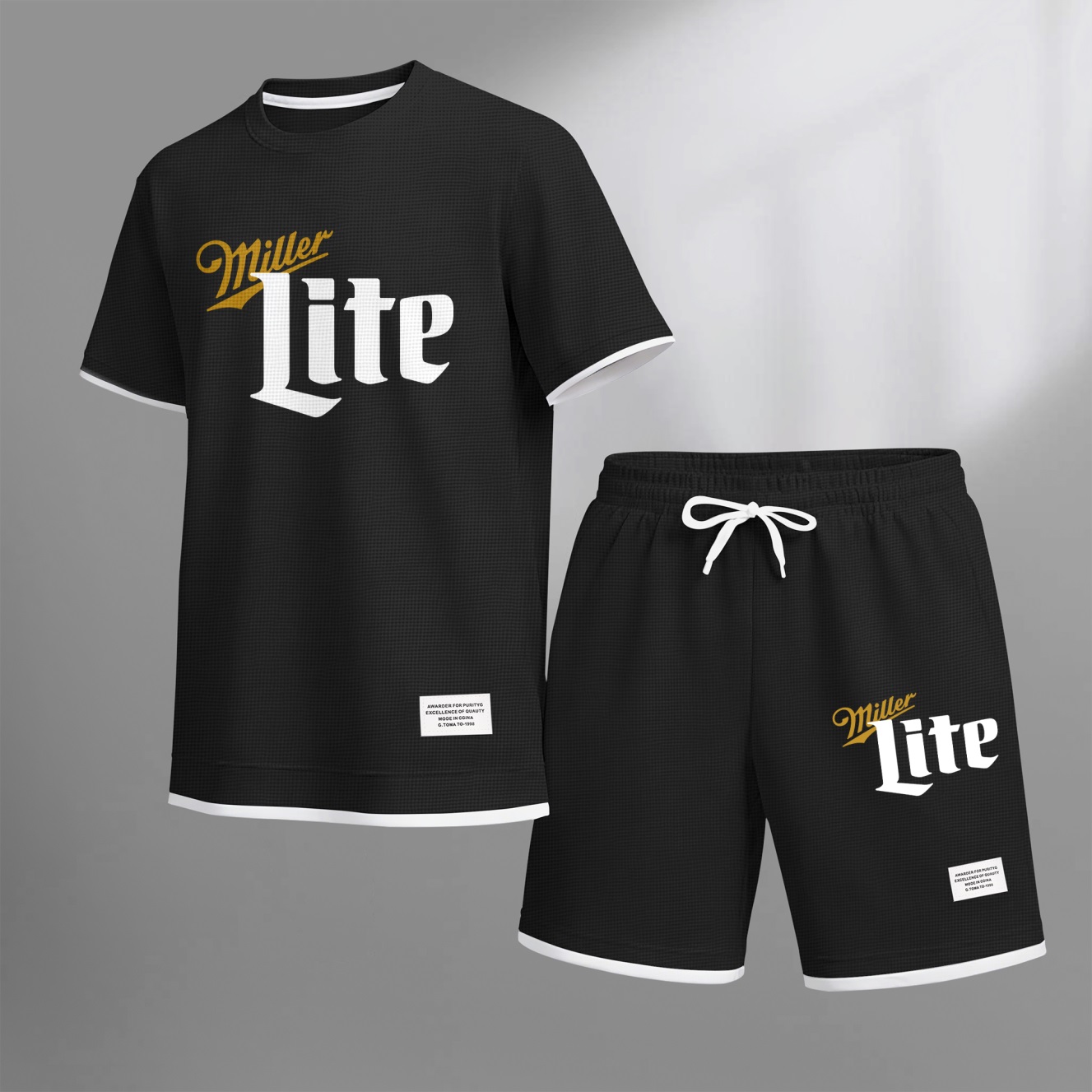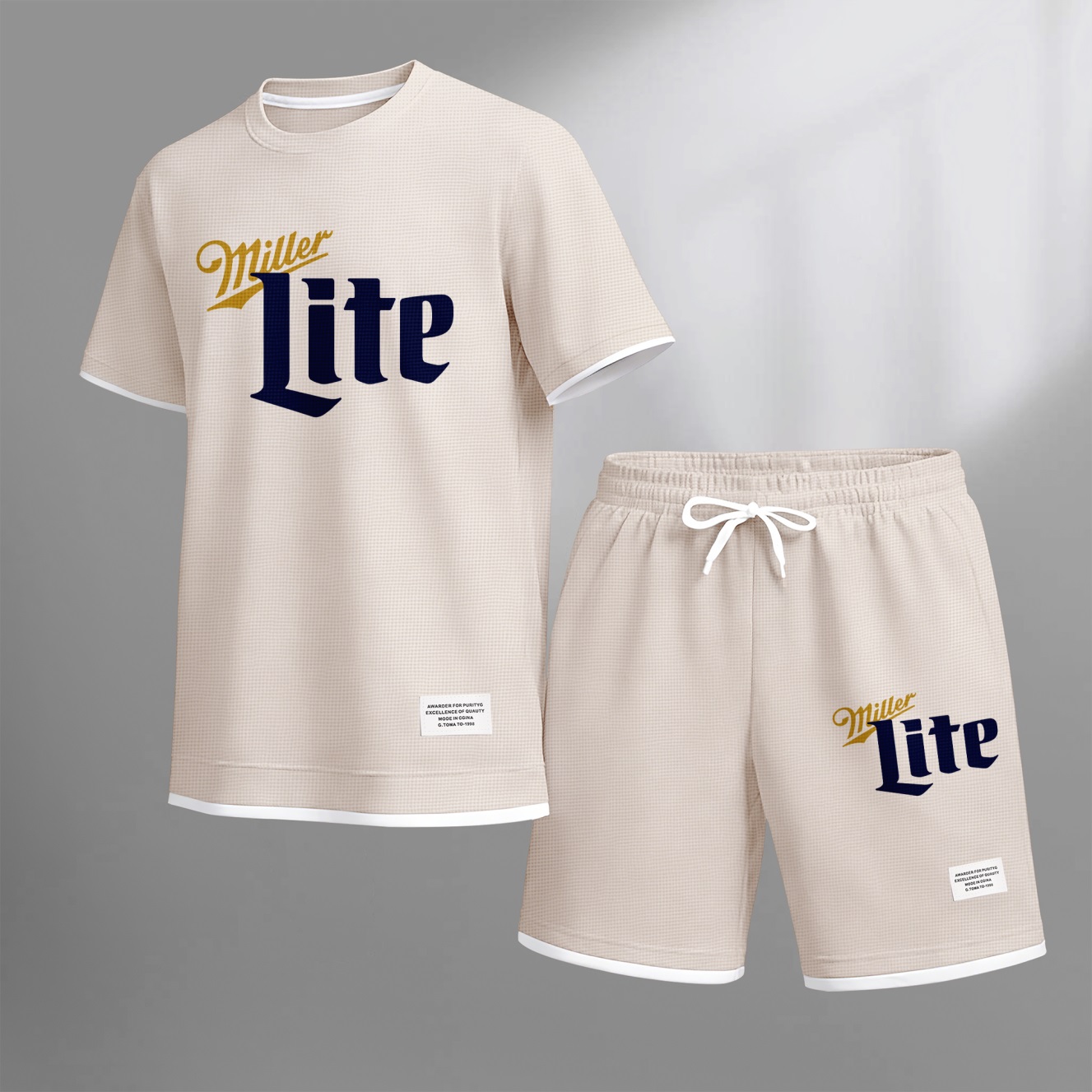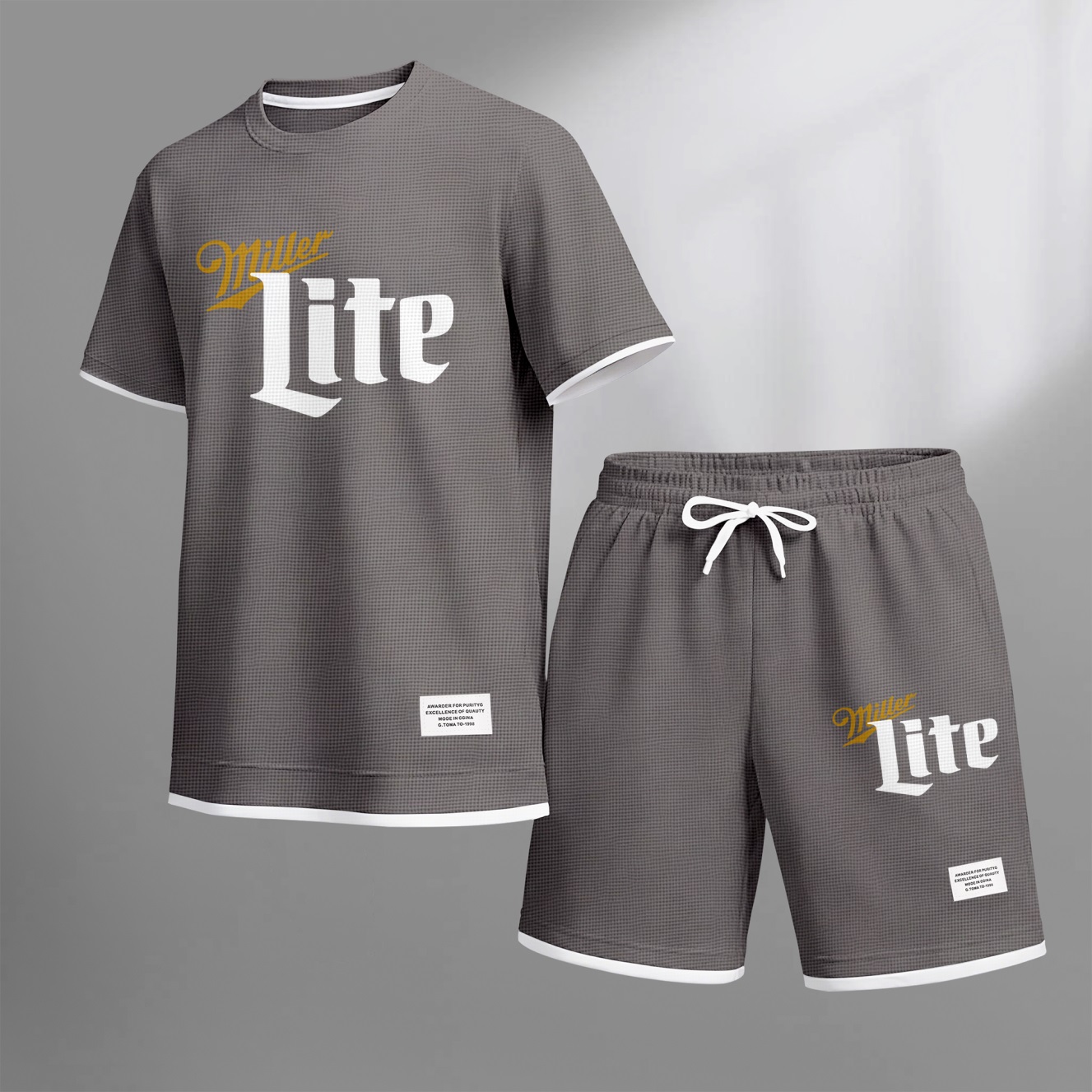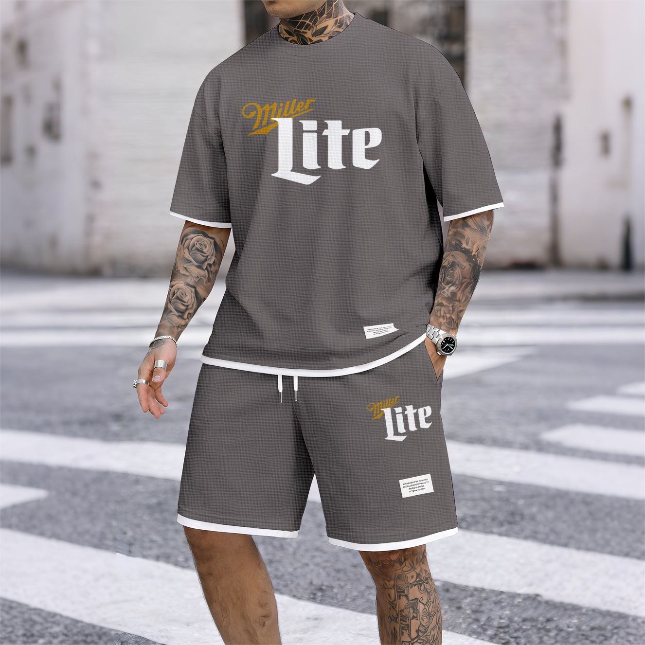 Men's Low-Calorie Beer Print Waffle Fabric Short-Sleeved Shirt And Shorts Set
