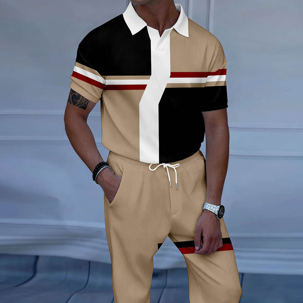 Men's Apricot & Black Geometric Printed Color Matching Luxury Casual Textured Polo Short Sleeve Suit