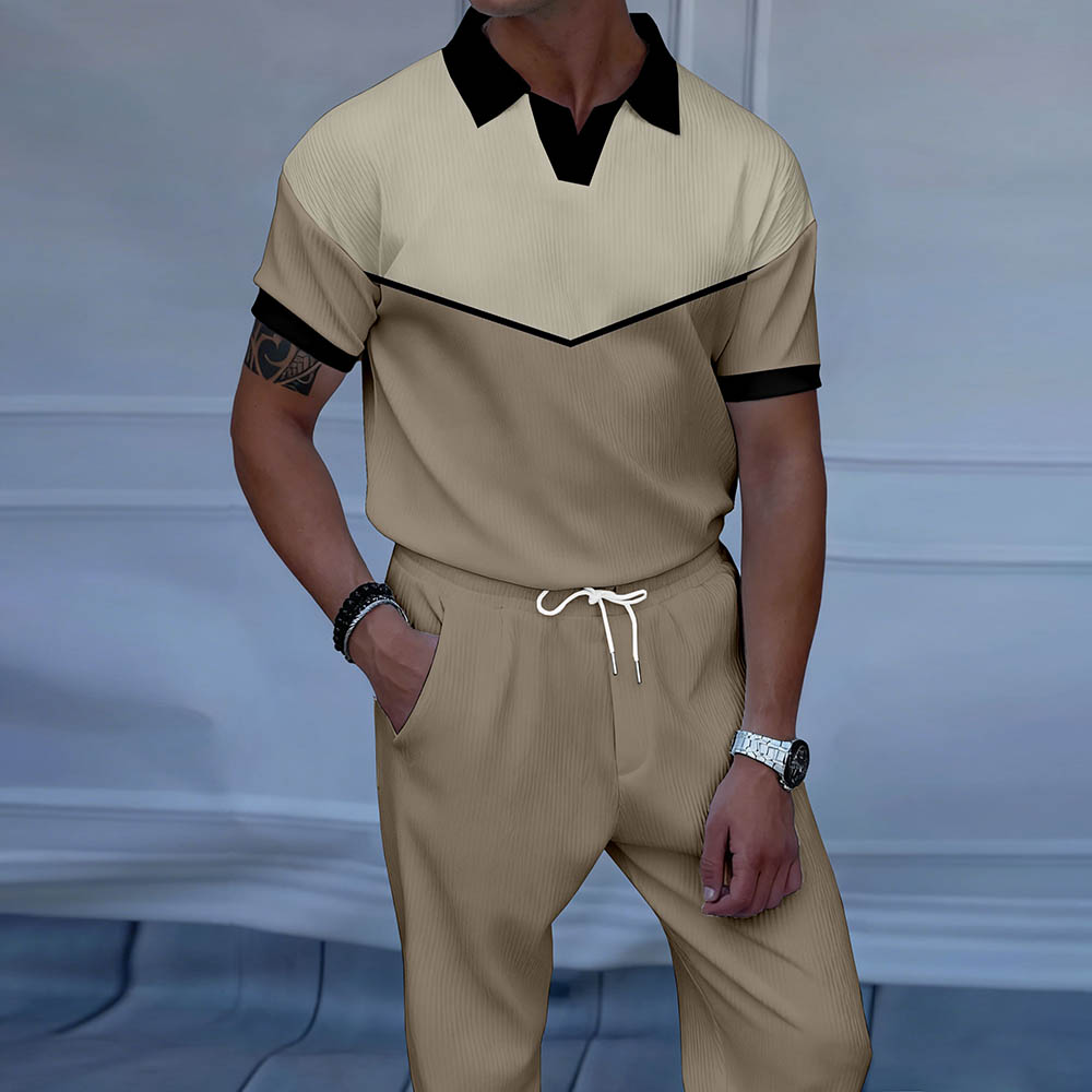 Men's Coffe & Khaki Color Matching Printed Luxury Casual Textured Polo Short Sleeve Suit