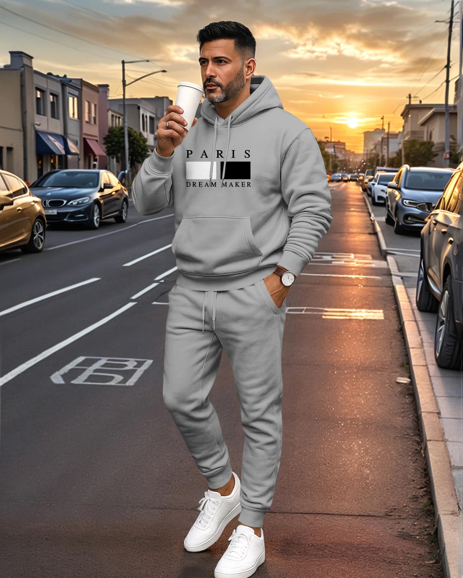 Men's Paris Letter Printed Hoodie And Drawstring Sweatpants Set 04
