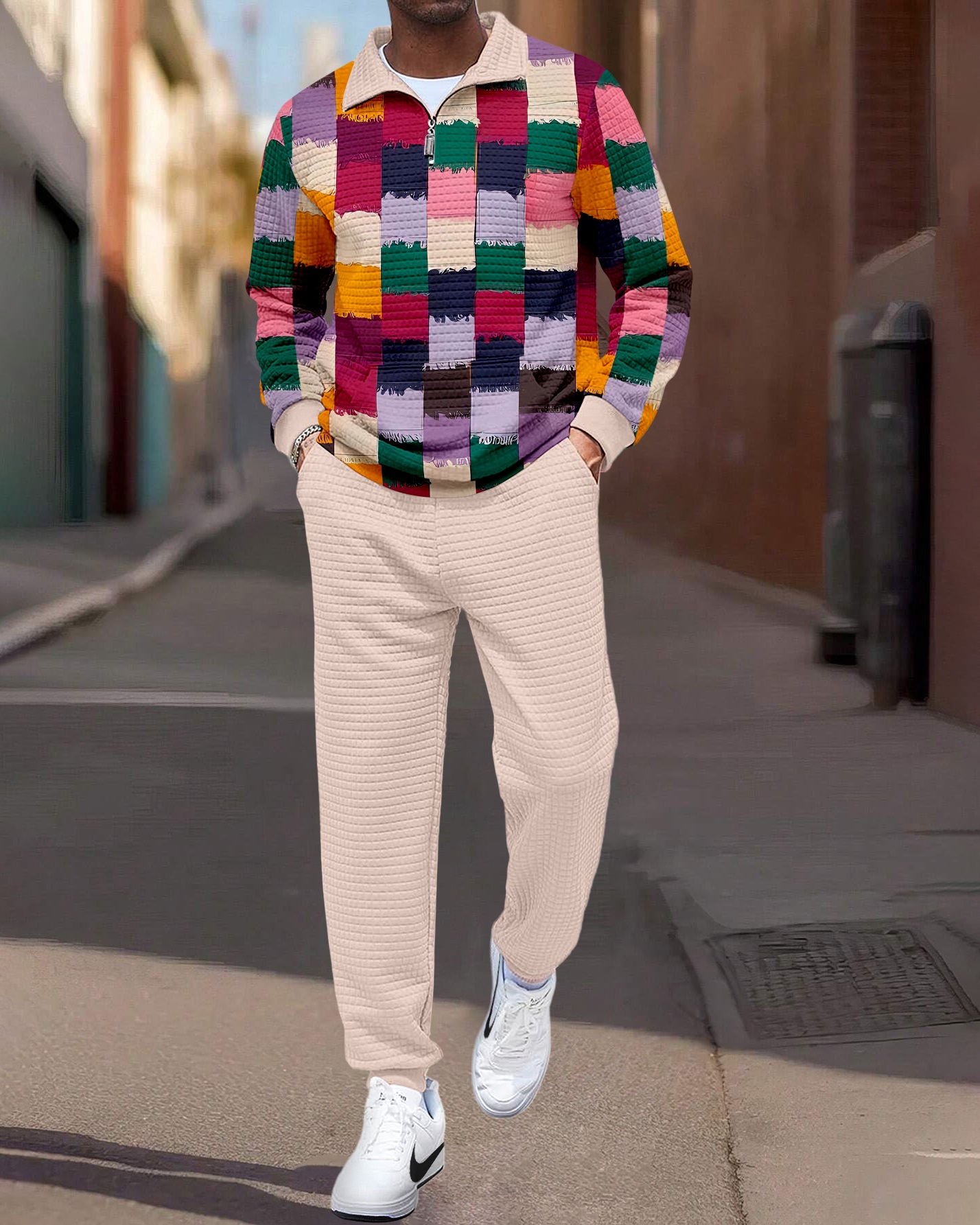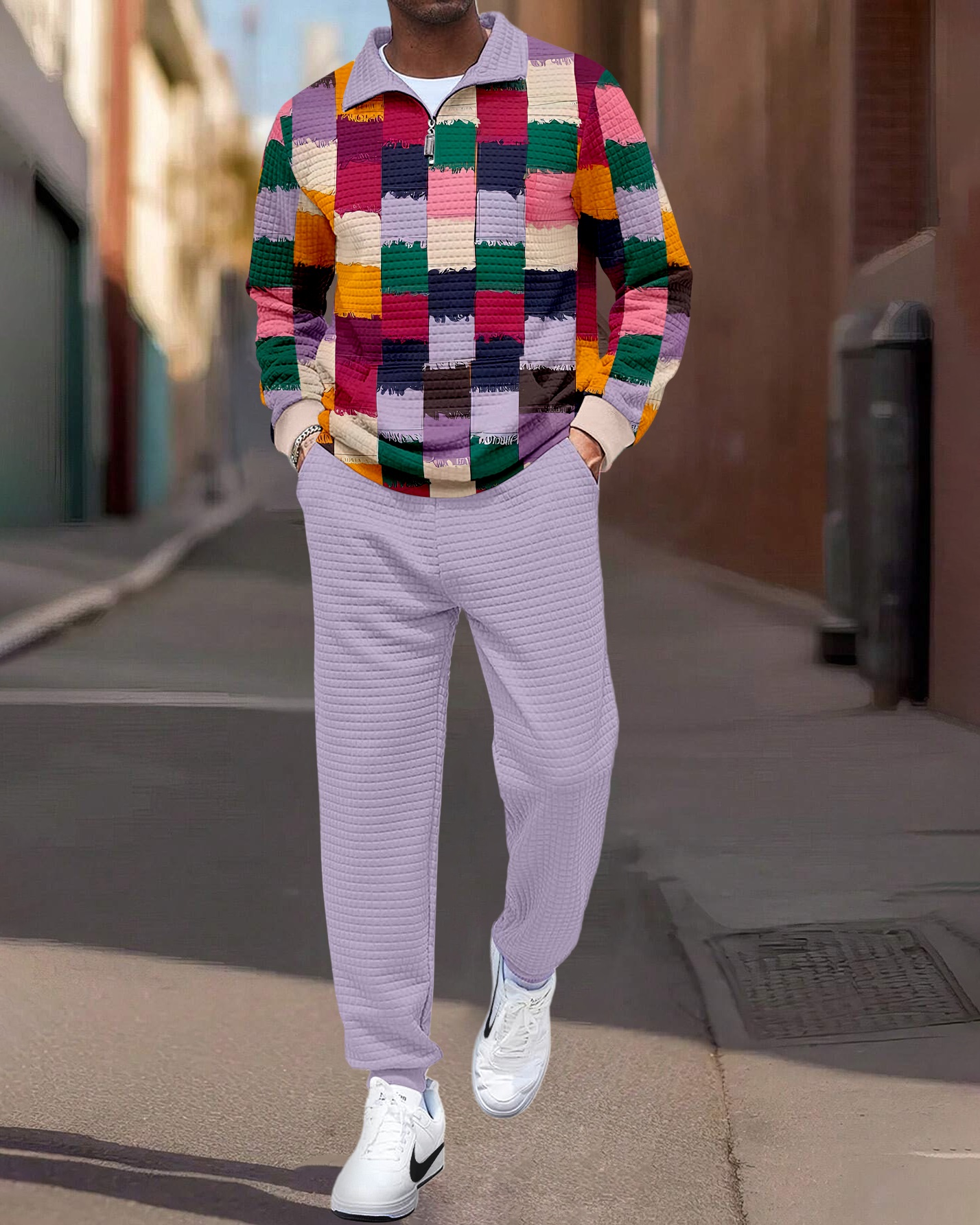 Men's Quarter Zipper Checked Jacquard Jogging Set 007