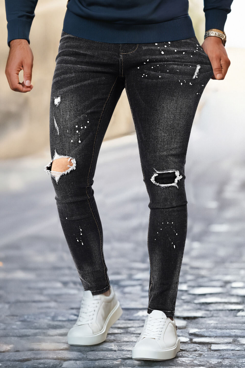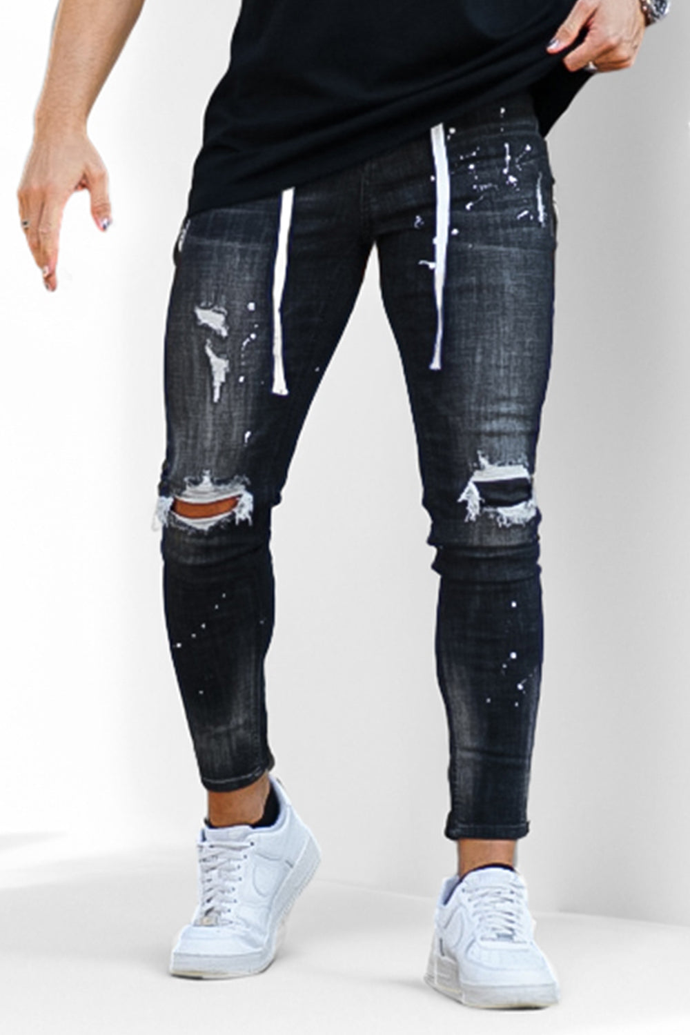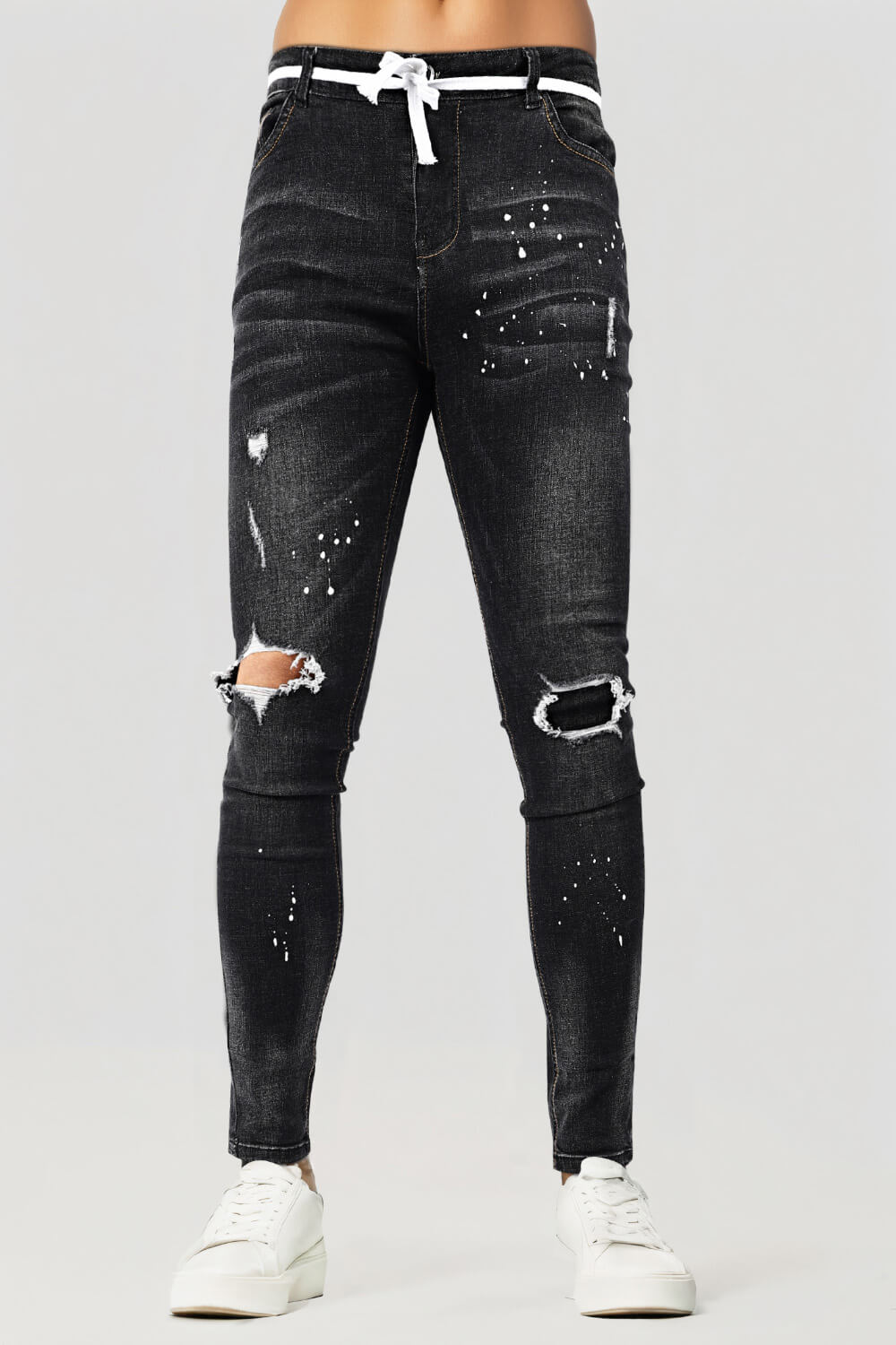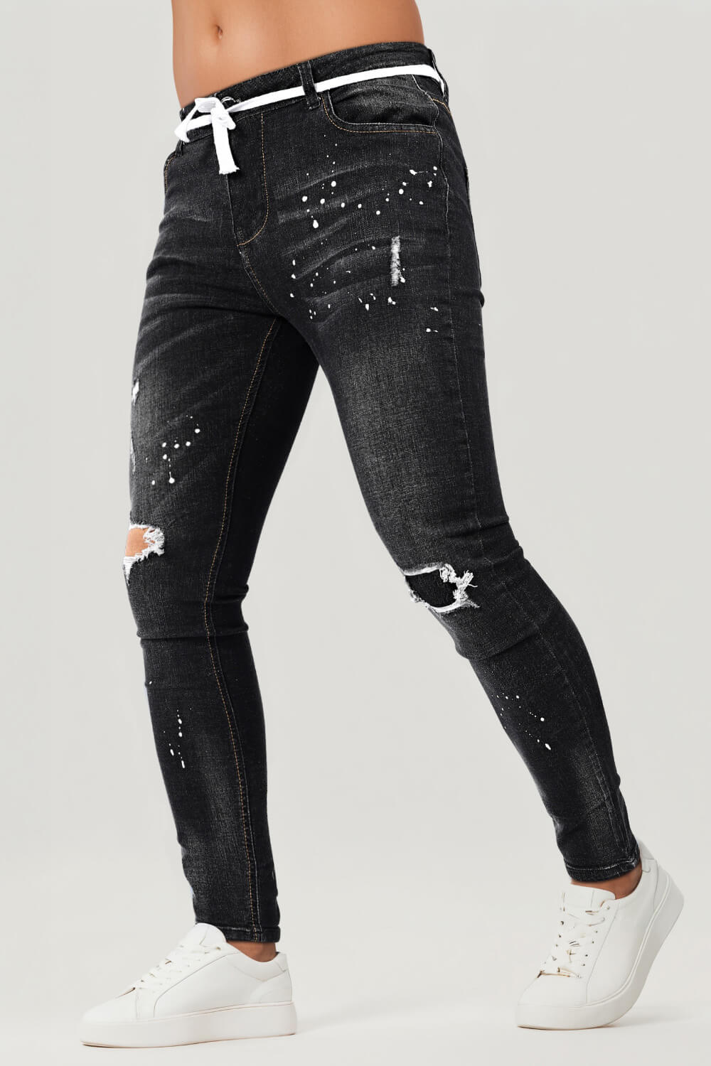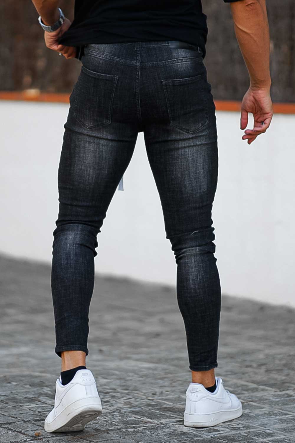 Super comfortable and high-stretch denim jeans designed with a form-flattering, muscular thighs fit. Our men's relaxed skinny jeans fit your lower body to wear all day long and can be paired with our popular basic tops.