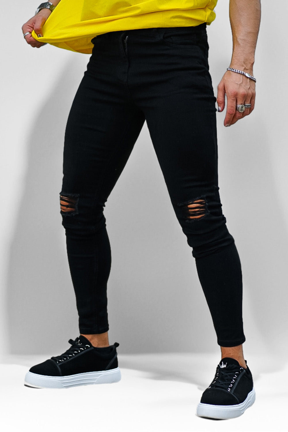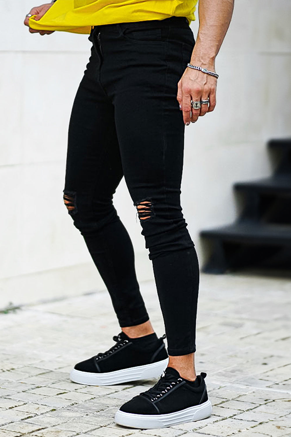 Super comfortable and high-stretch denim jeans designed with a form-flattering, muscular thighs fit. Our men's ripped knee skinny jeans fit your lower body to wear all day long and can be paired with our popular basic tops.