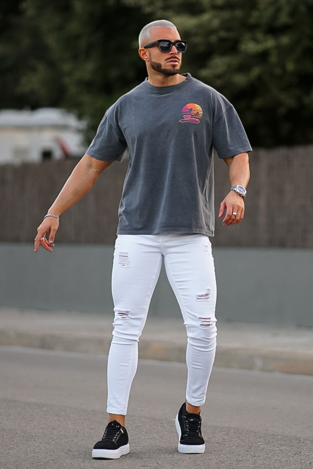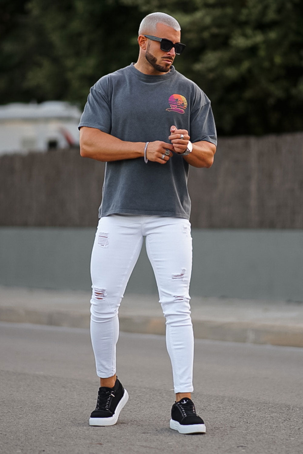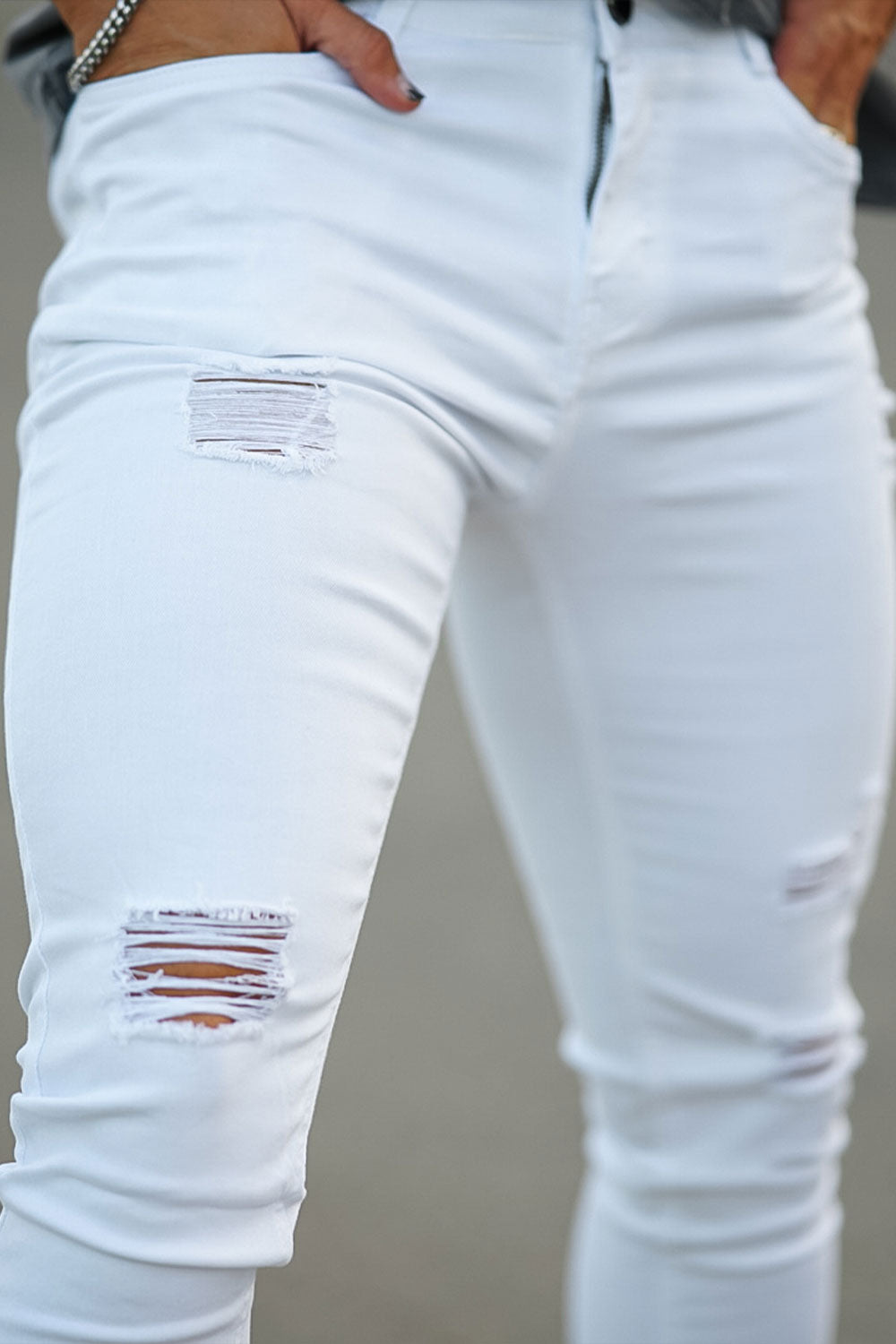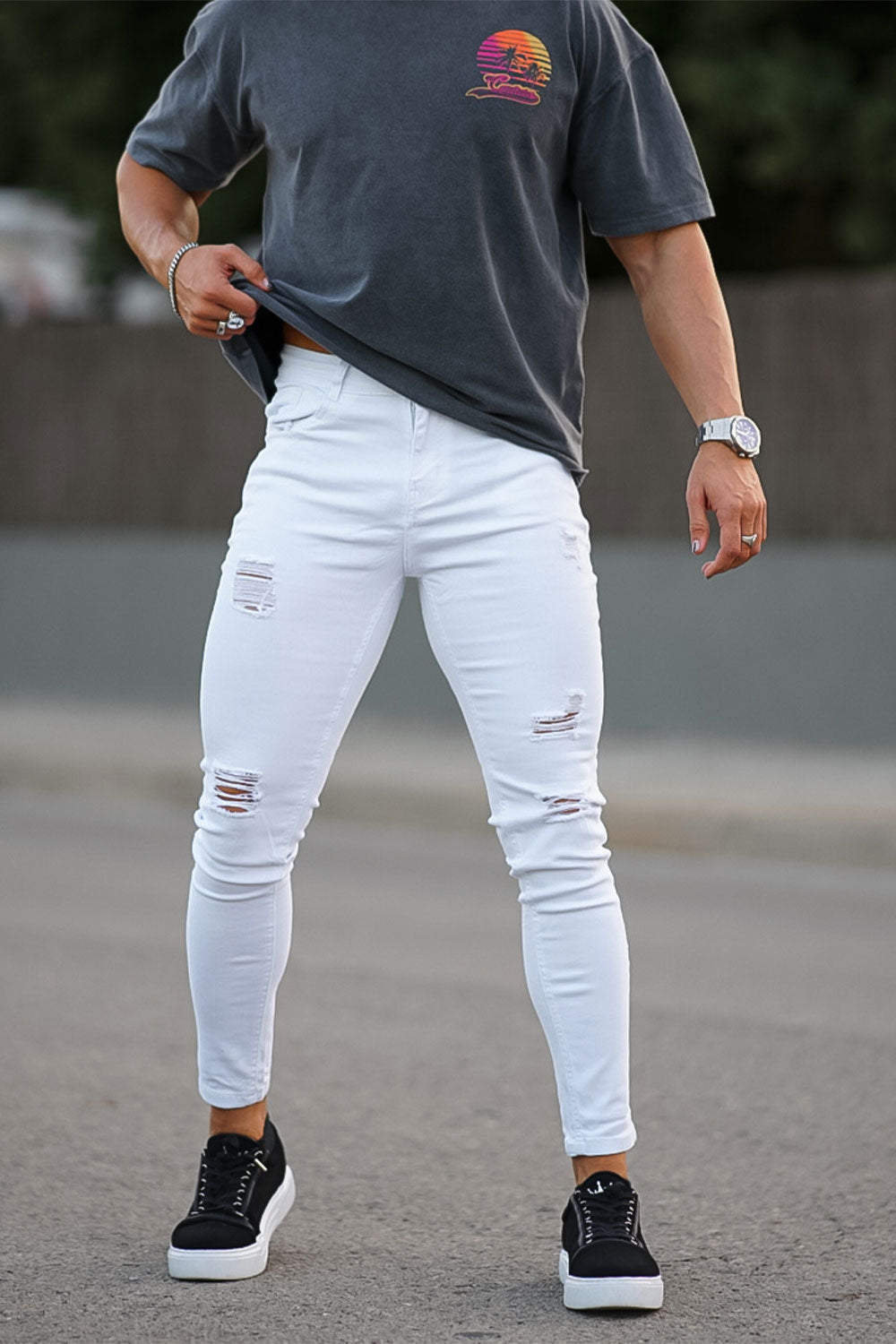 Super comfortable and high-stretch denim jeans designed with a form-flattering, muscular thighs fit. Our men's ripped skinny jeans fit your lower body to wear all day long and can be paired with our popular basic tops.