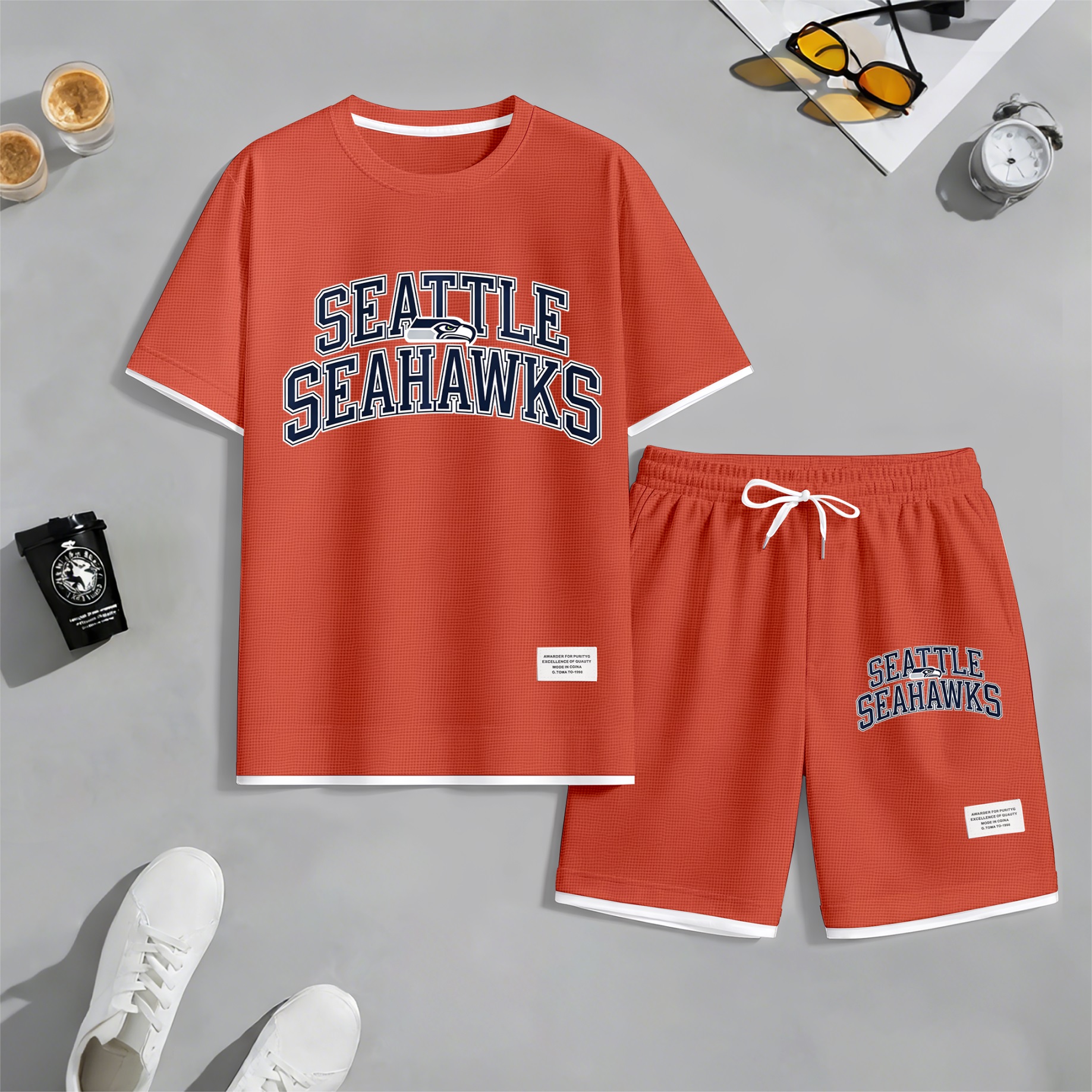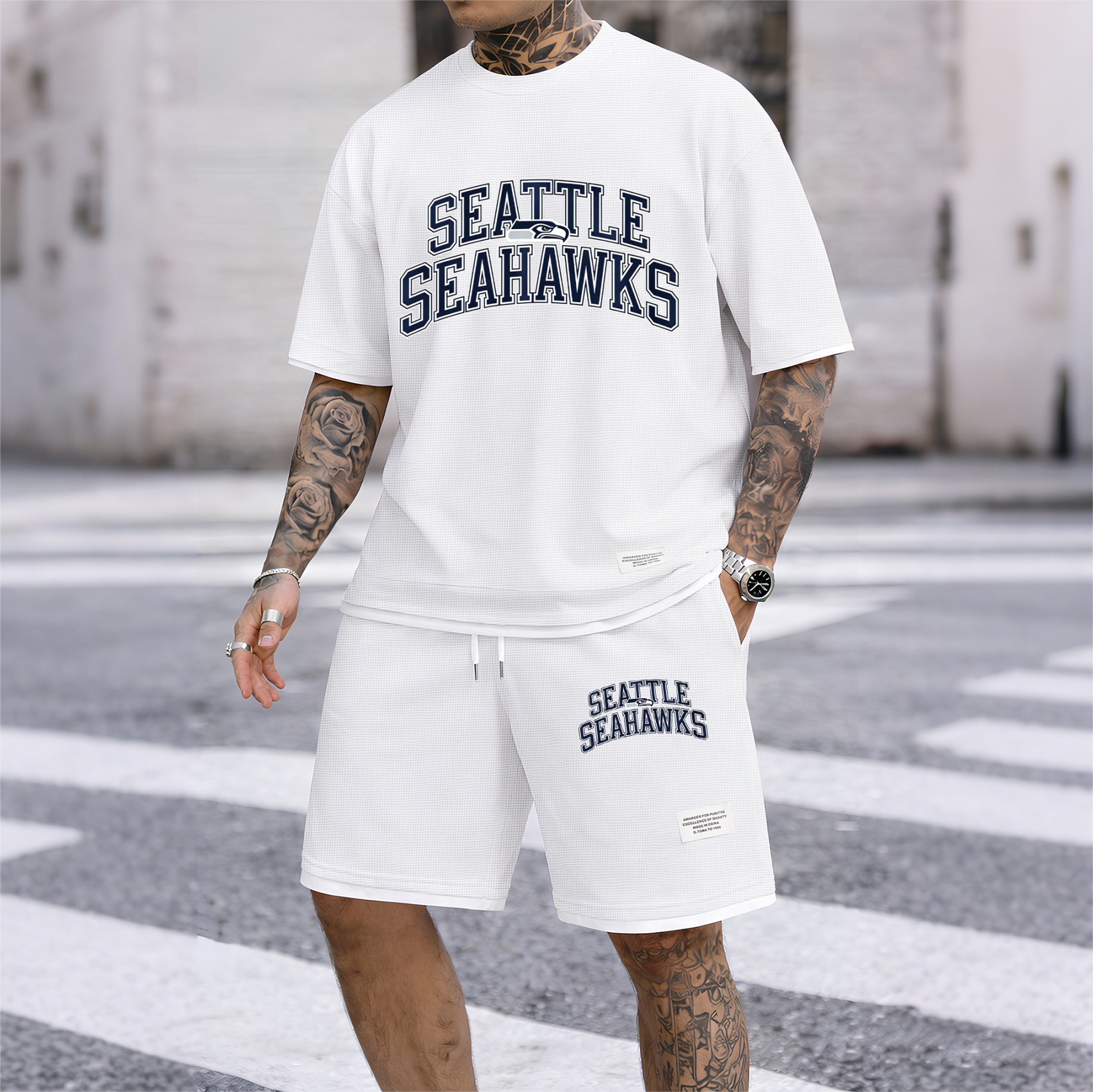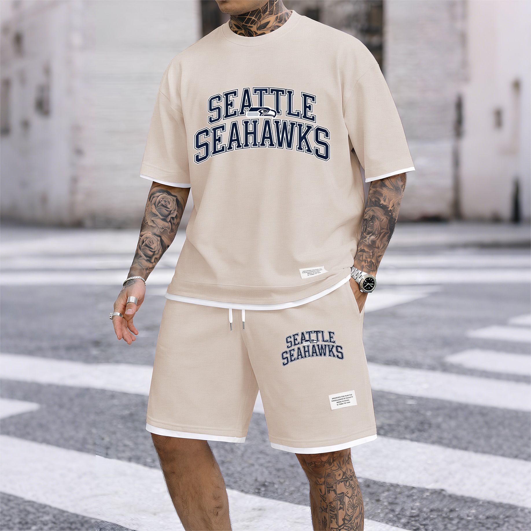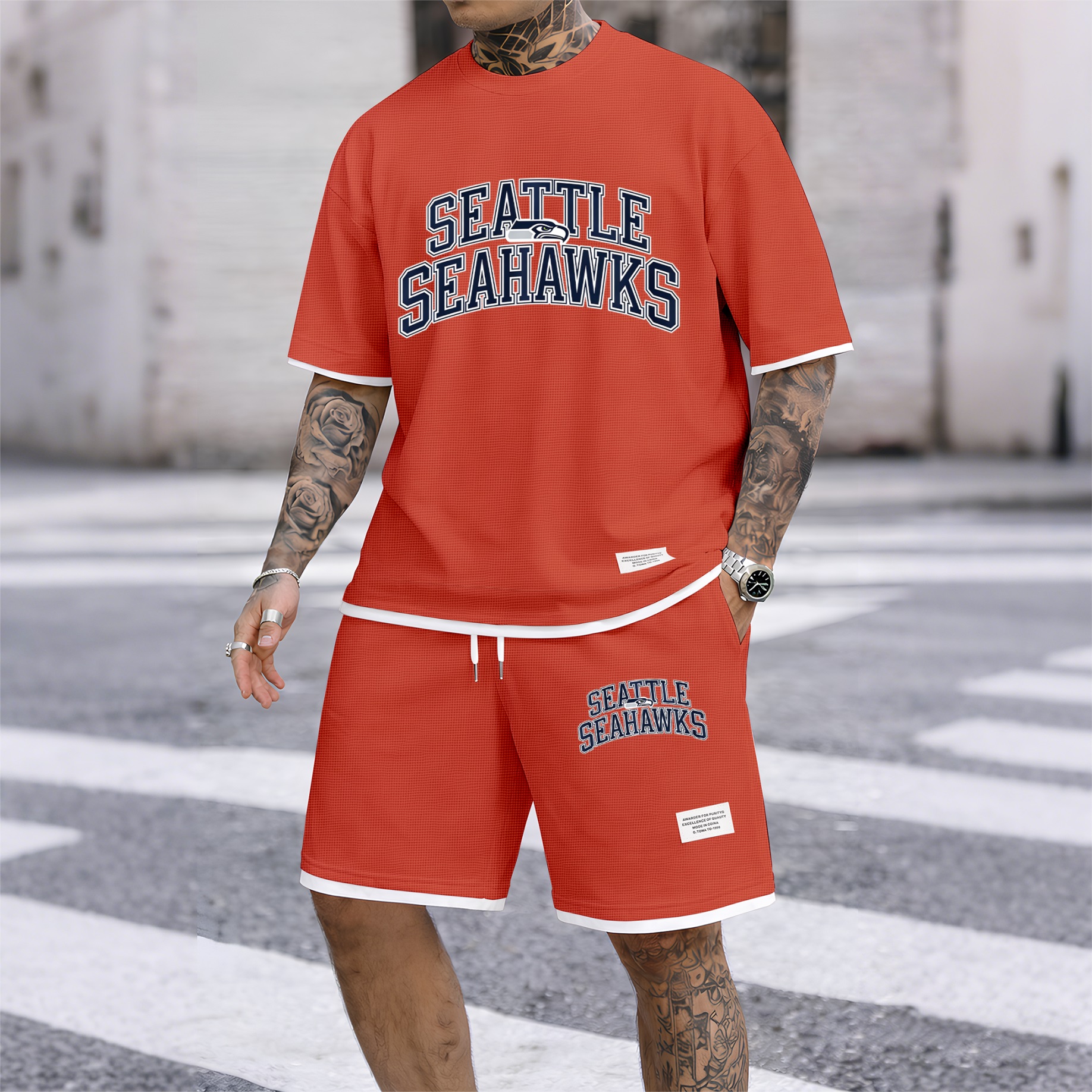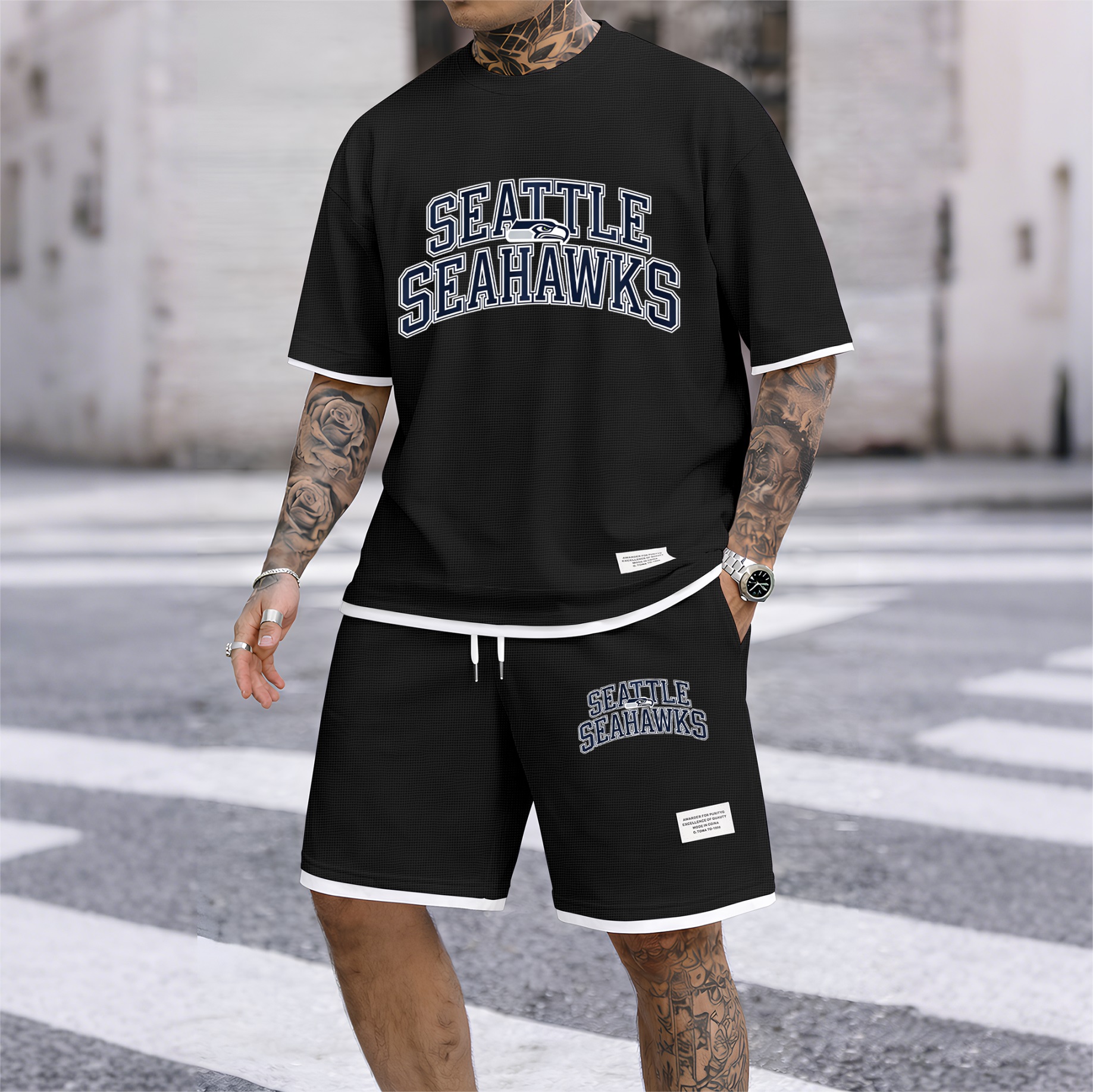 Men's Rugby-Themed Waffle Fabric Short-Sleeved Shirt And Shorts Set 009
