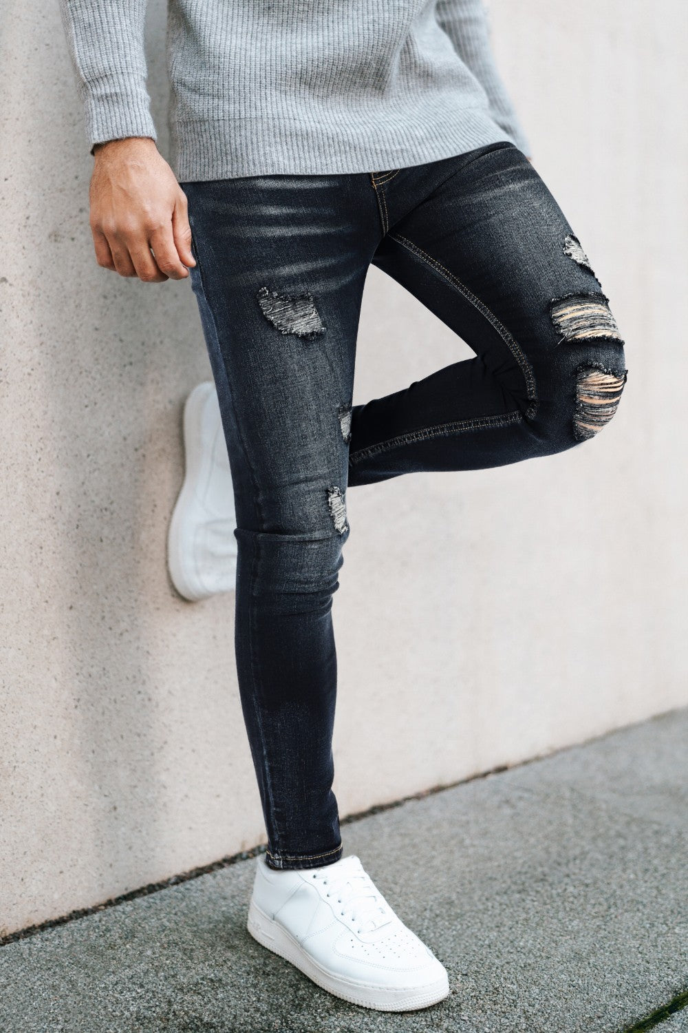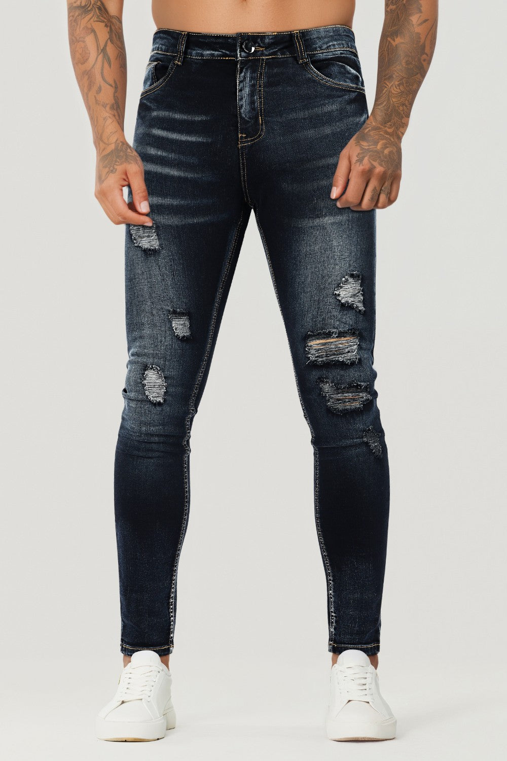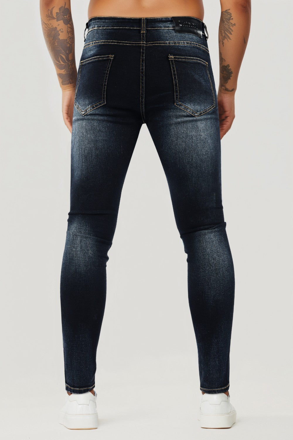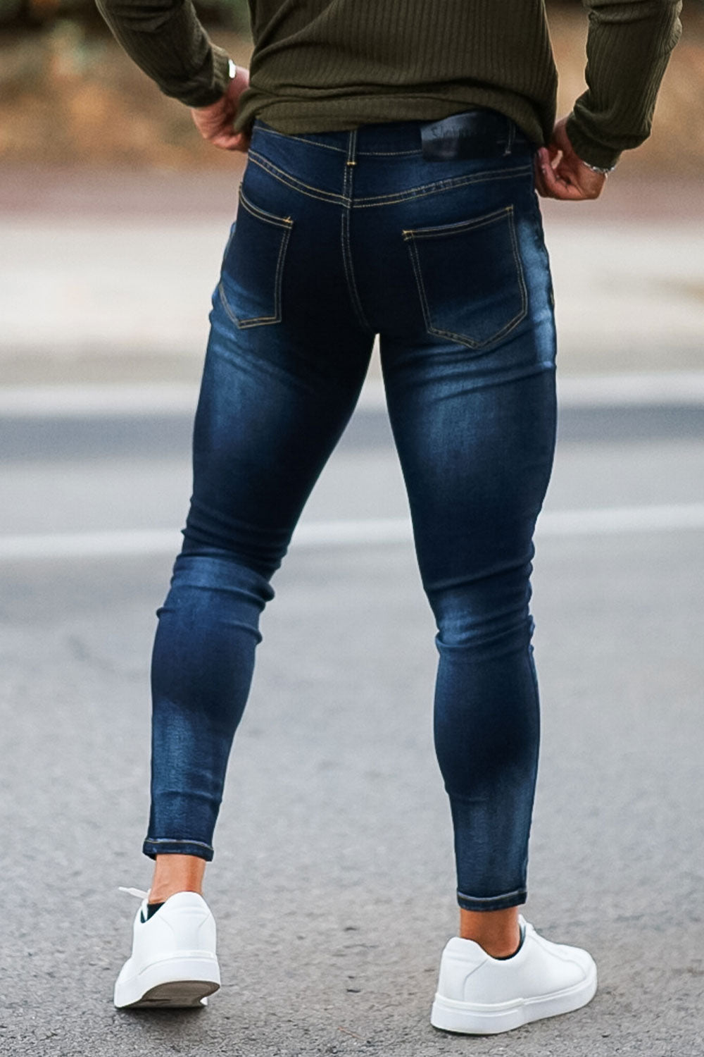 Super comfortable and high-stretch denim jeans designed with a form-flattering, muscular thighs fit. Our men's vintage skinny jeans fit your lower body to wear all day long and can be paired with our popular basic tops.