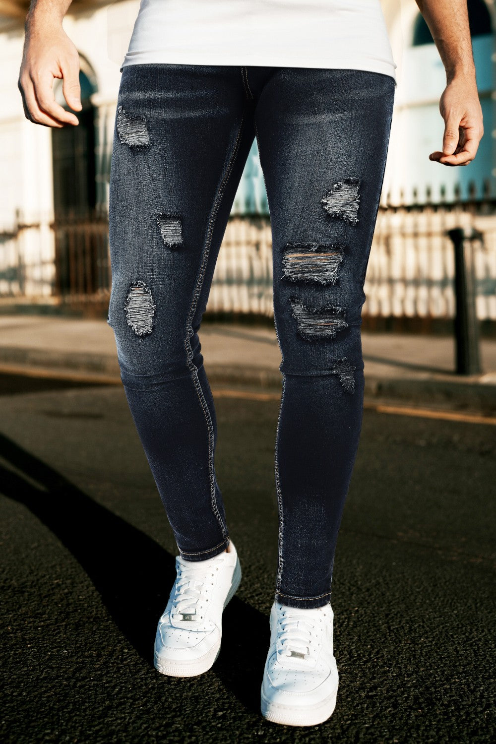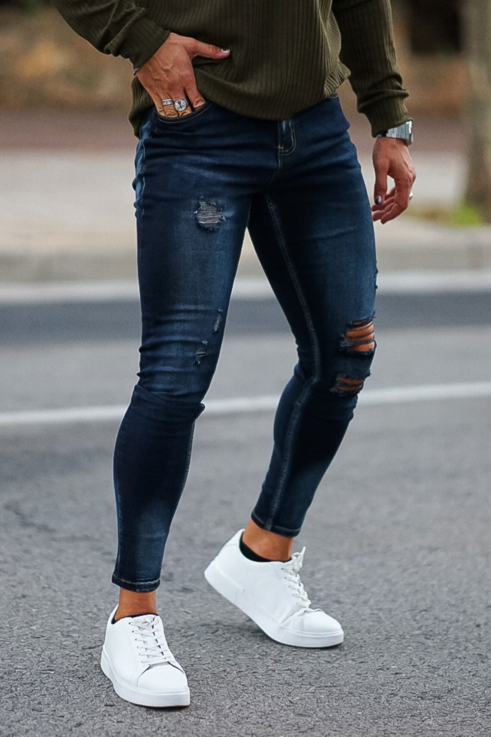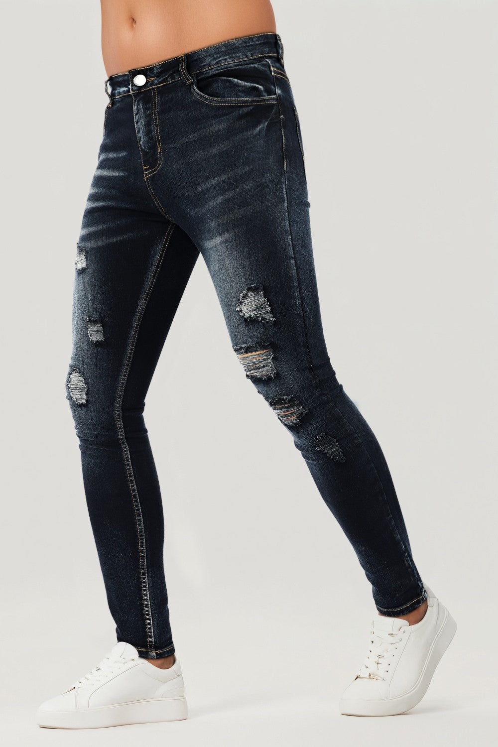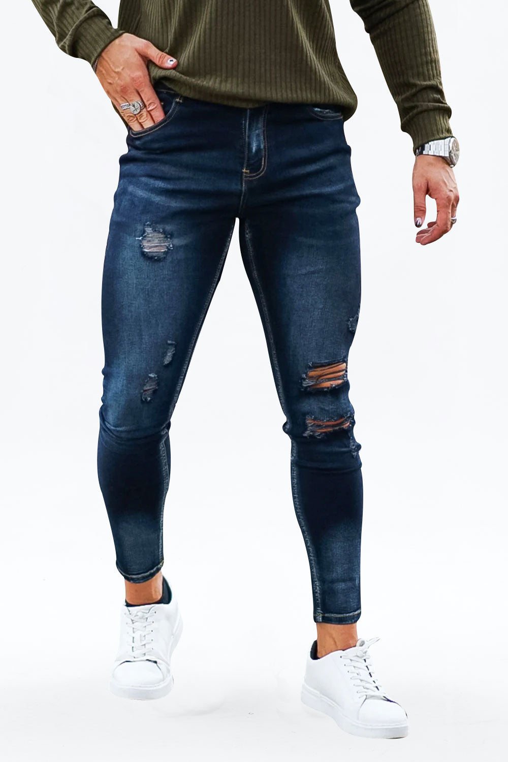 Super comfortable and high-stretch denim jeans designed with a form-flattering, muscular thighs fit. Our men's vintage skinny jeans fit your lower body to wear all day long and can be paired with our popular basic tops.