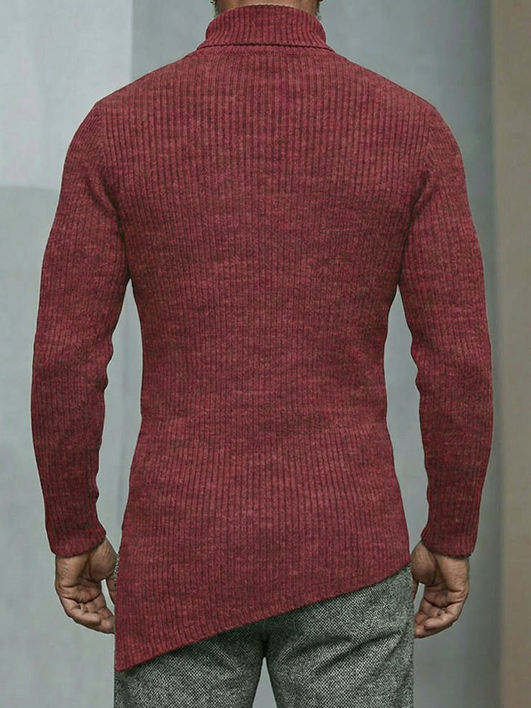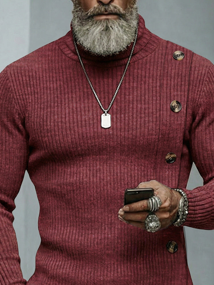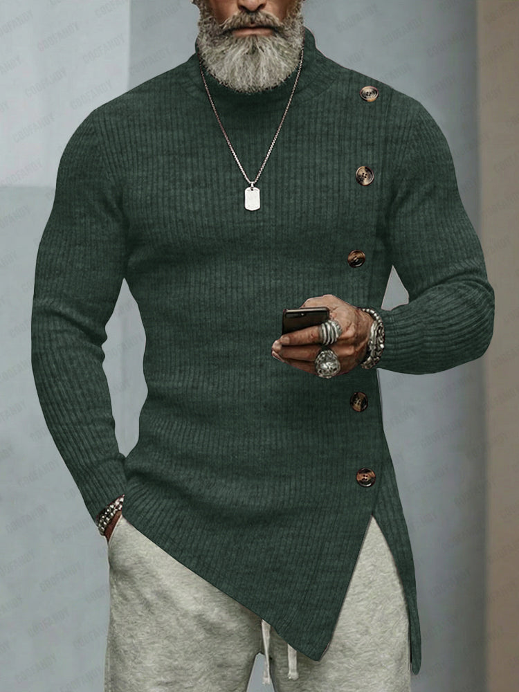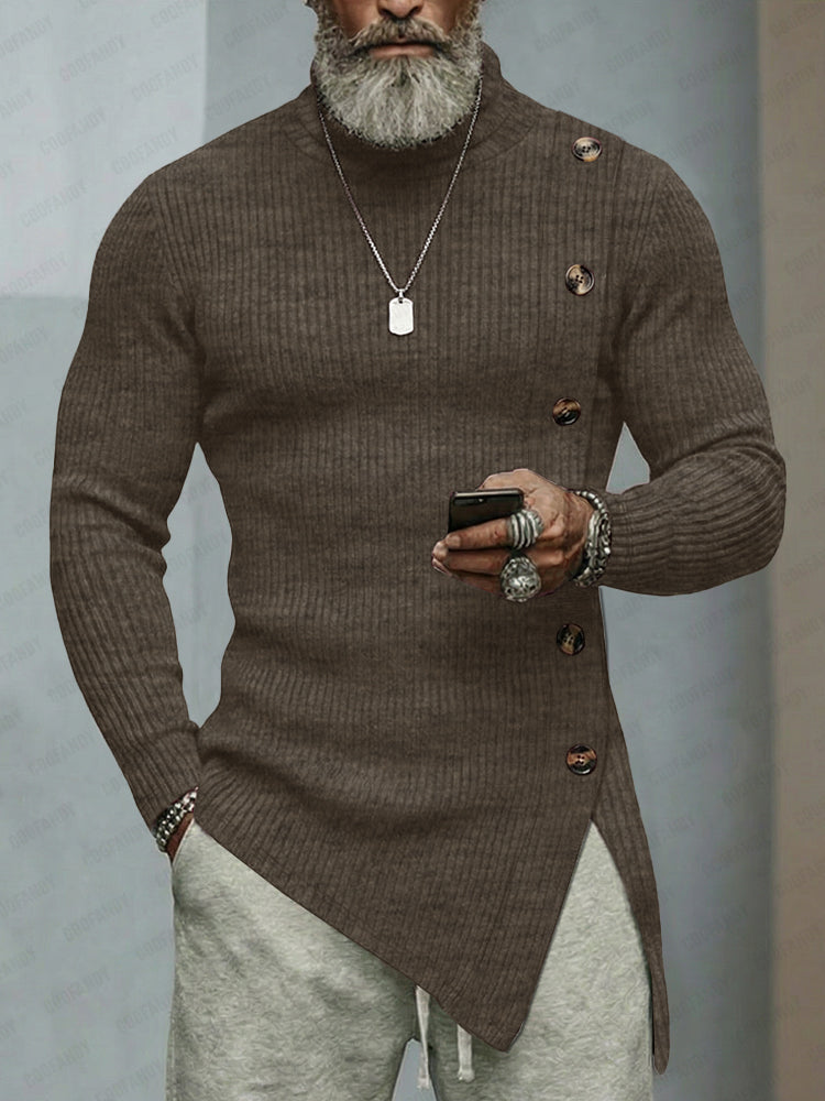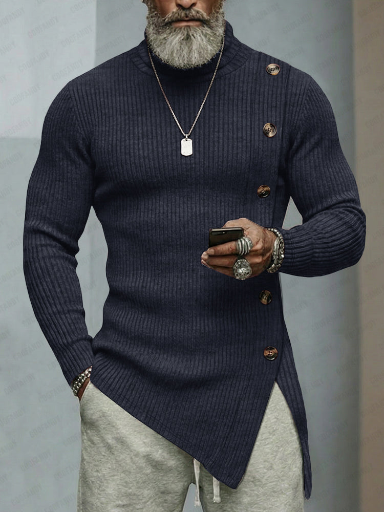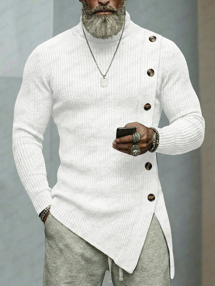 Design: Elastic knit fabric, turtleneck, asymmetric hem, button accents