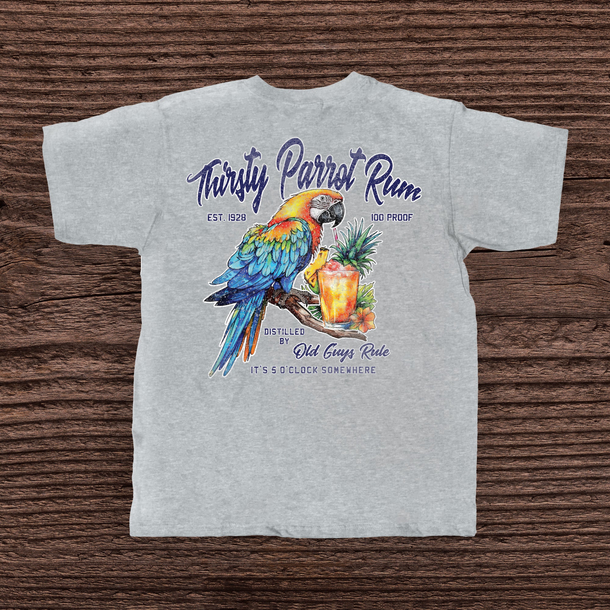 | Shirt Back Text: "Thirsty Parrot Rum - It's 5 0'Clock Somewhere - EST 1923 - 100 Proof - Distilled By Old Guys Rule" |