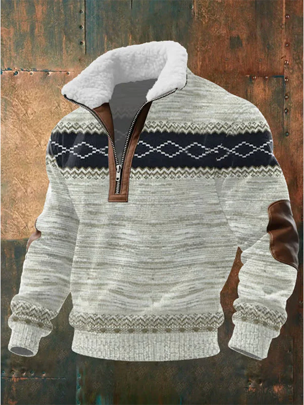Flower Gray Patchwork Ethnic Printed Zip-Up Sweater With Collar