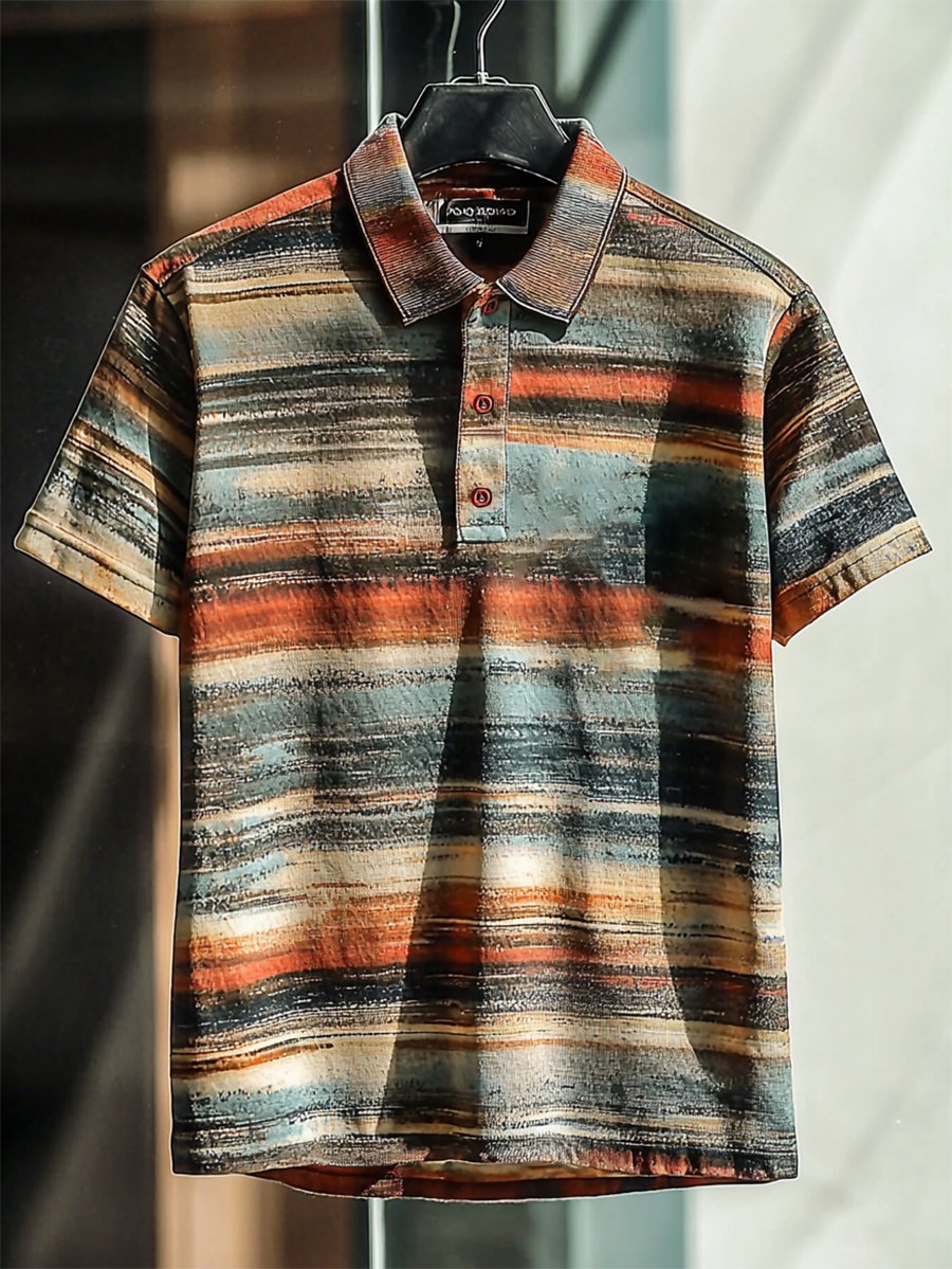 Men's Business Casual Stripe Print Button Short Sleeve Polo Shirt