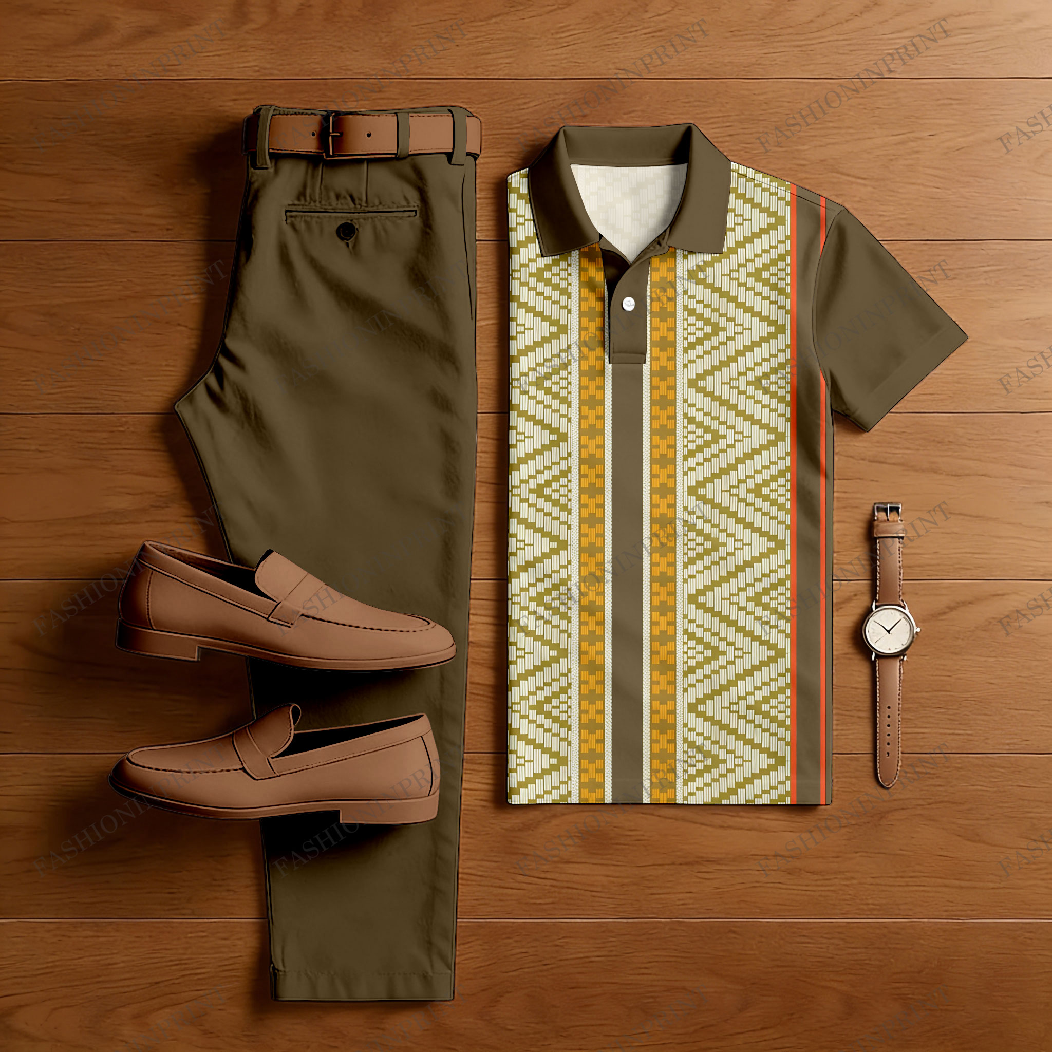 Men's Casual Army Green & Beige Color Matching Ethnie Style Printed Short Sleeved Polo Shirt & Trousers Two-Piece Set