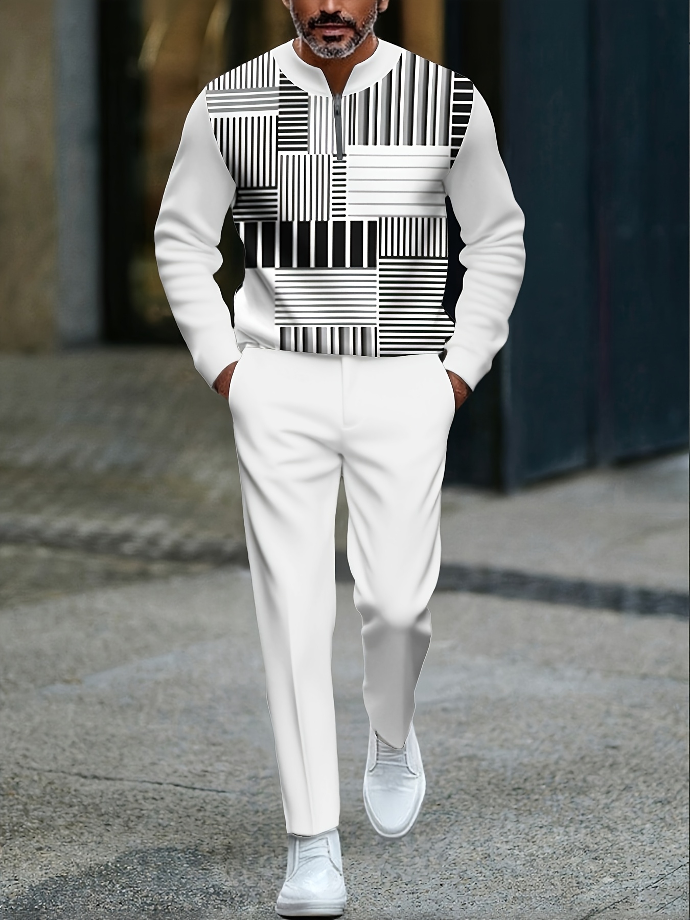 Men's Casual Black And White Color Matching Striped Printed Round-Neck Zipper Long Sleeved Trousers Two-Piece Set