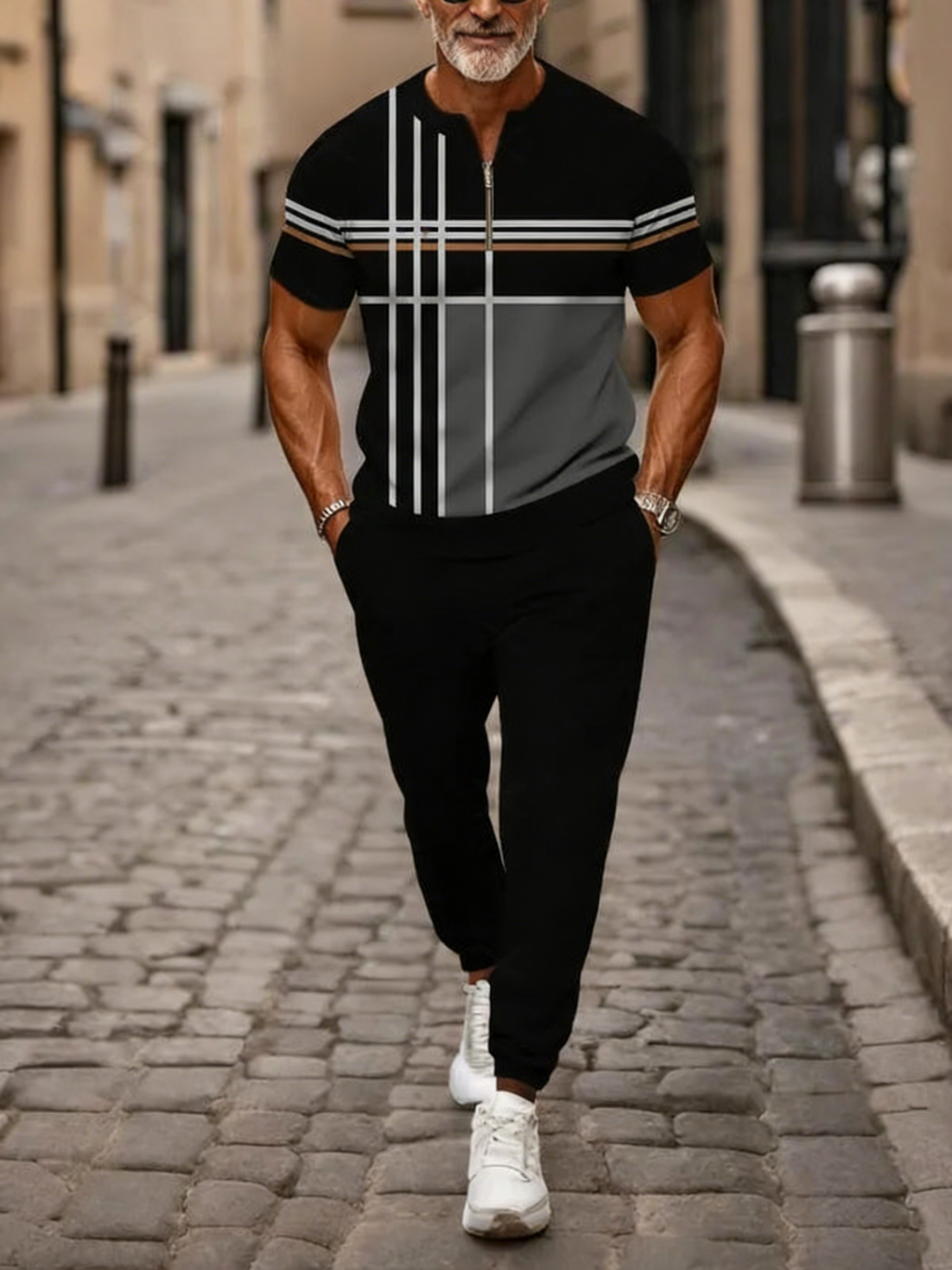 Men's Casual Black & White Color Matching Geometric Printed Round-Neck Zipper Short Sleeved Tops & Trousers Two-Piece Set