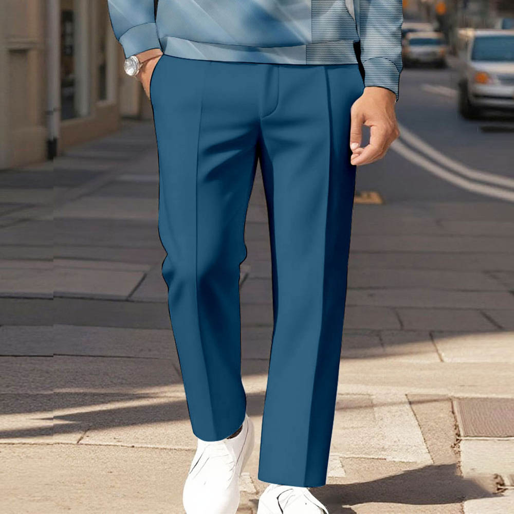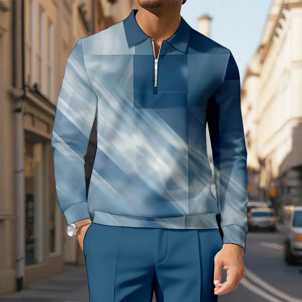 Men's Casual Blue Color Matching Geometric Printed Polo-Collar Zipper Long Sleeved Trousers Two-Piece Set