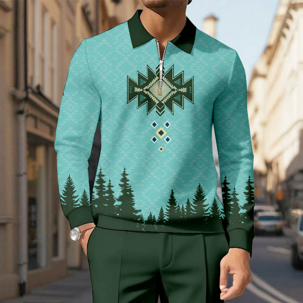Men's Casual Blue & Green Color Matching Tree Printed Polo-Collar Zipper Long Sleeved Trousers Two-Piece Set
