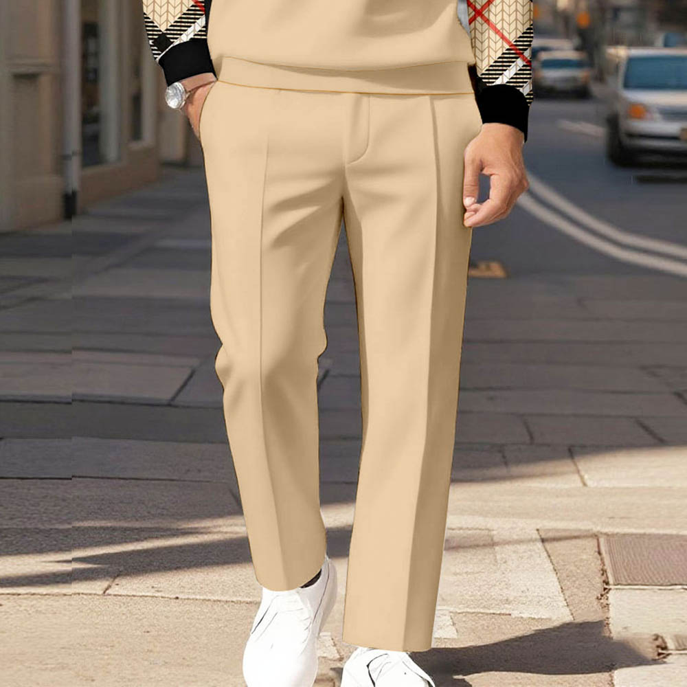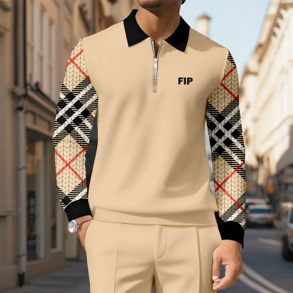 Men's Casual Color Matching Checked Printed Polo-Collar Zipper Long Sleeved Trousers Apricot Two-Piece Set