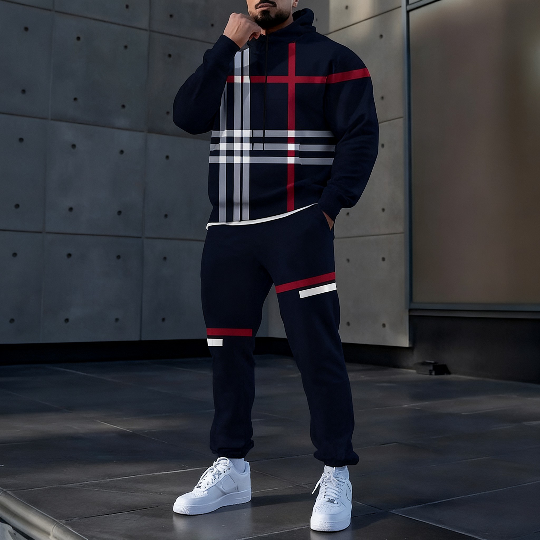 Men's Casual Color Matching Printed Hoodies Long Sleeved Trousers Two-Piece Set