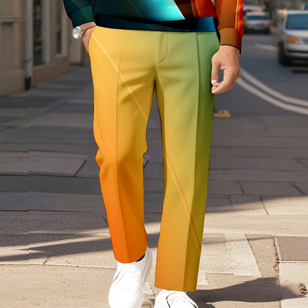 Men's Casual Orange Green Gradient Printed Polo-Collar Zipper Long Sleeved Trousers Two-Piece Set