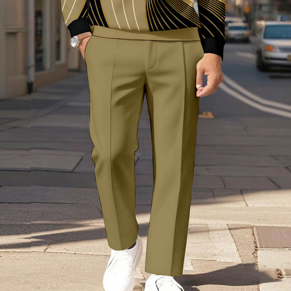 Men's Casual Army Green Color Matching Geometric Printed Polo-Collar Zipper Long Sleeved Trousers Two-Piece Set
