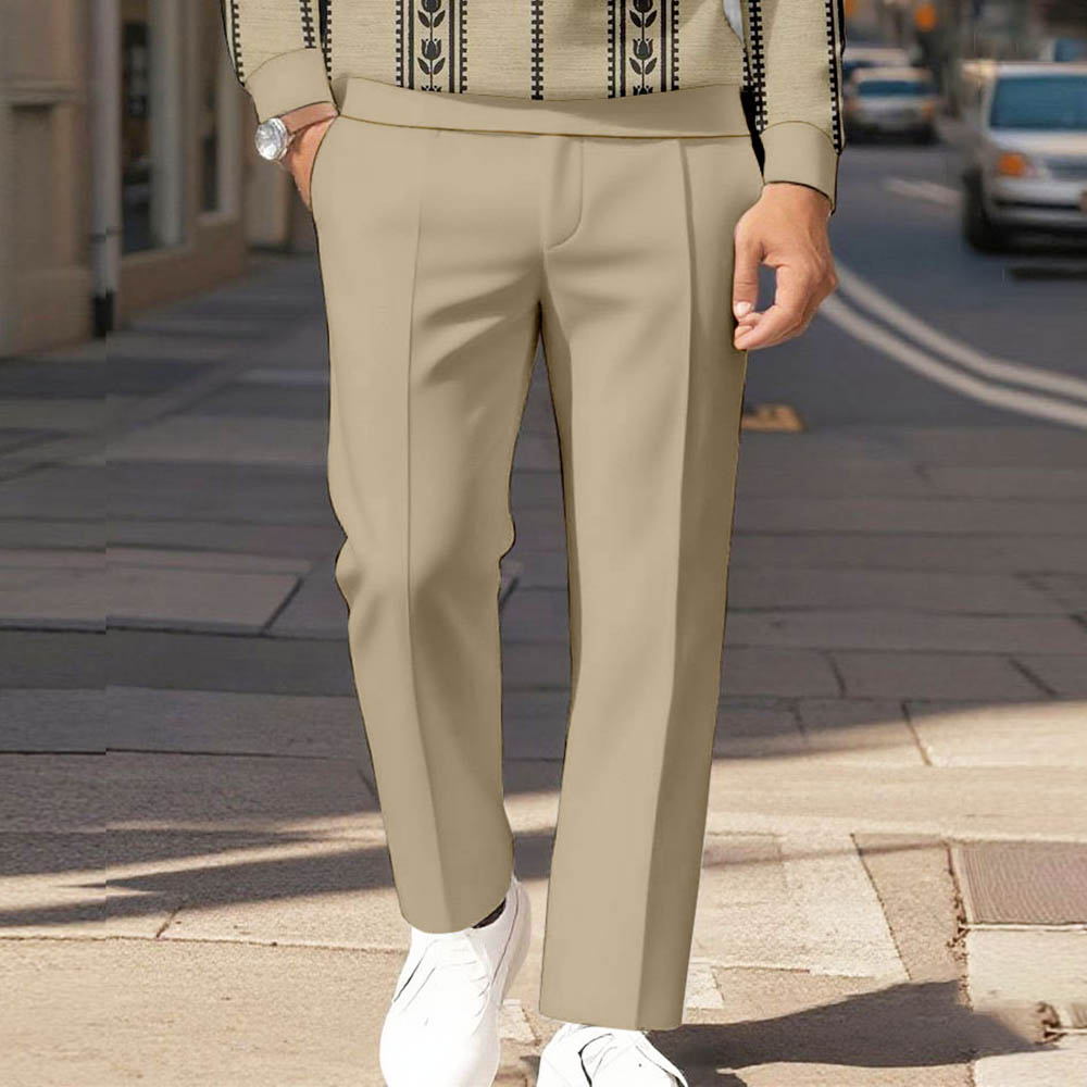 Men's Casual Khaki & Black Color Matching Flower Printed Polo-Collar Zipper Long Sleeved Trousers Two-Piece Set