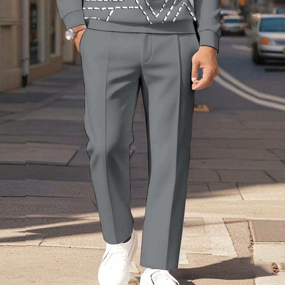 Men's Casual Color Matching Geometric Printed Polo-Collar Zipper Long Sleeved Trousers Gray Two-Piece Set