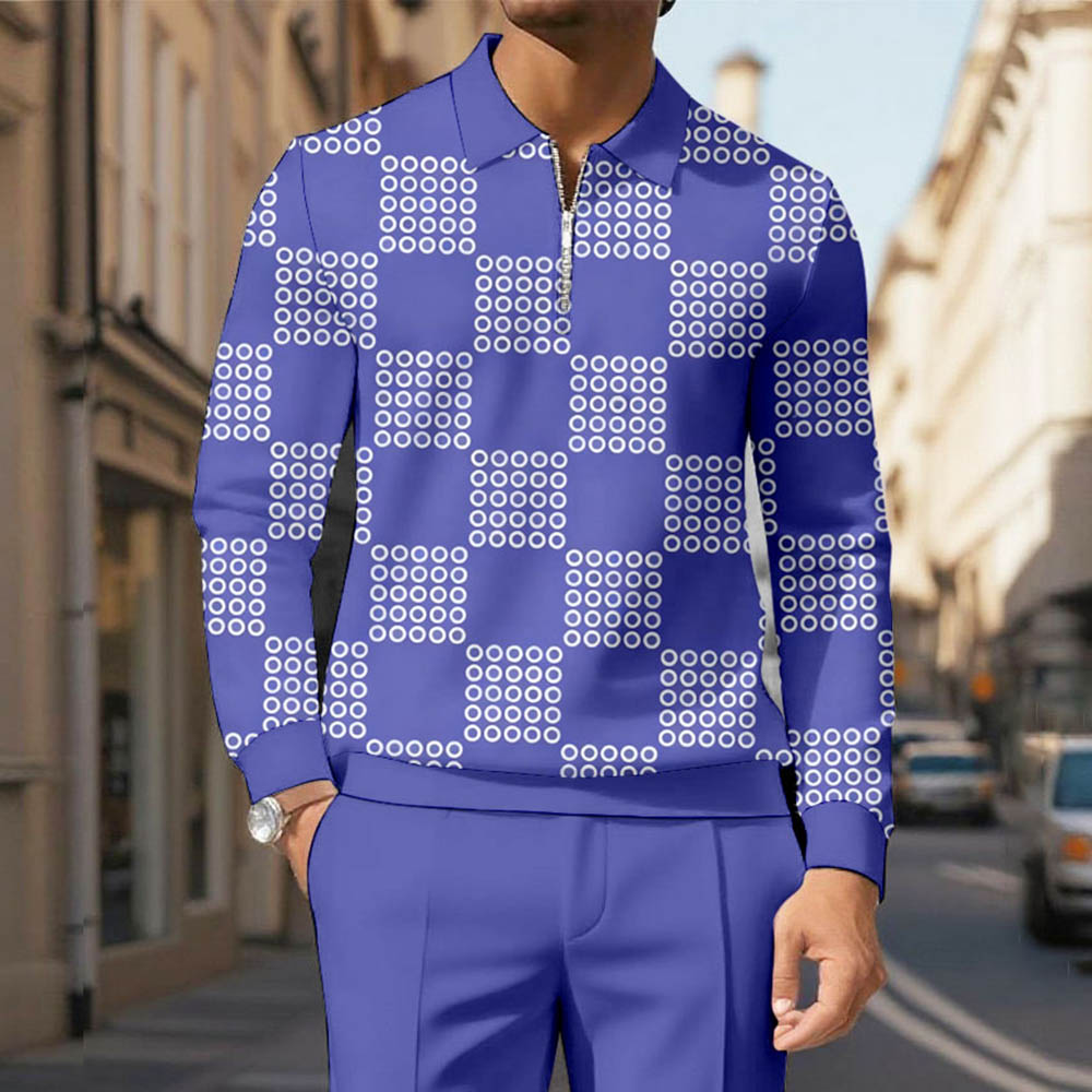 Men's Casual Purple & White Color Matching Checked Printed Polo-Collar Zipper Long Sleeved Trousers Two-Piece Set