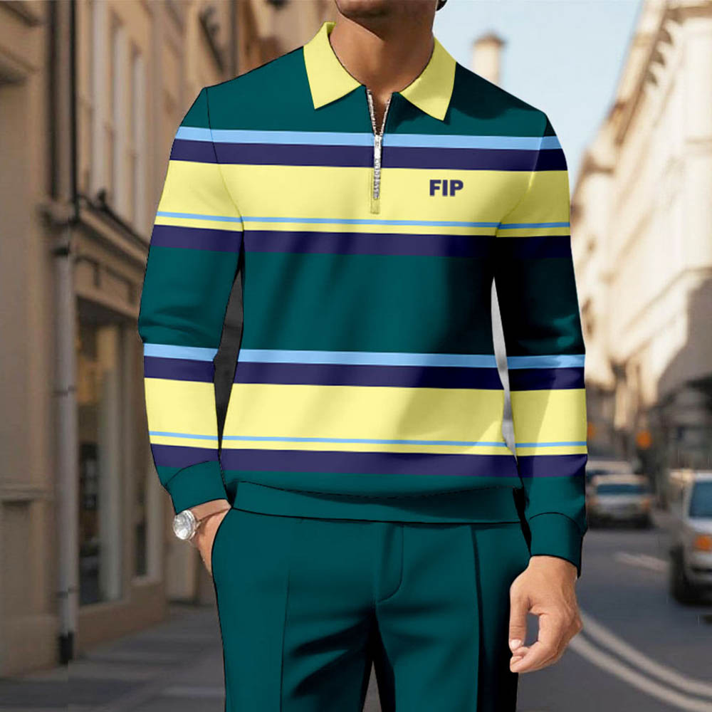 Men's Casual Green & Yellow Color Matching Striped Printed Polo-Collar Zipper Long Sleeved Trousers Two-Piece Set