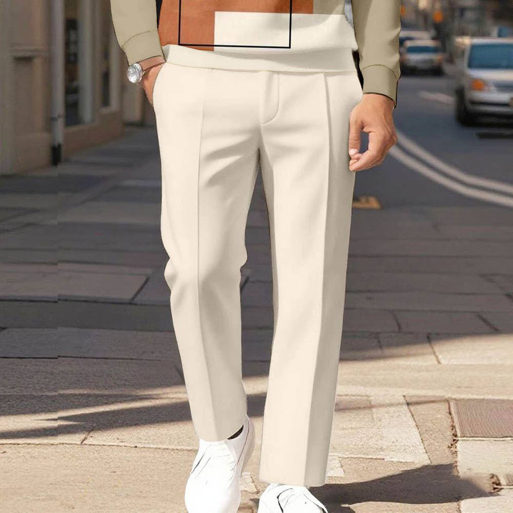 Men's Casual Khaki Color Matching Geometric Printed Polo-Collar Zipper Long Sleeved Trousers Two-Piece Set