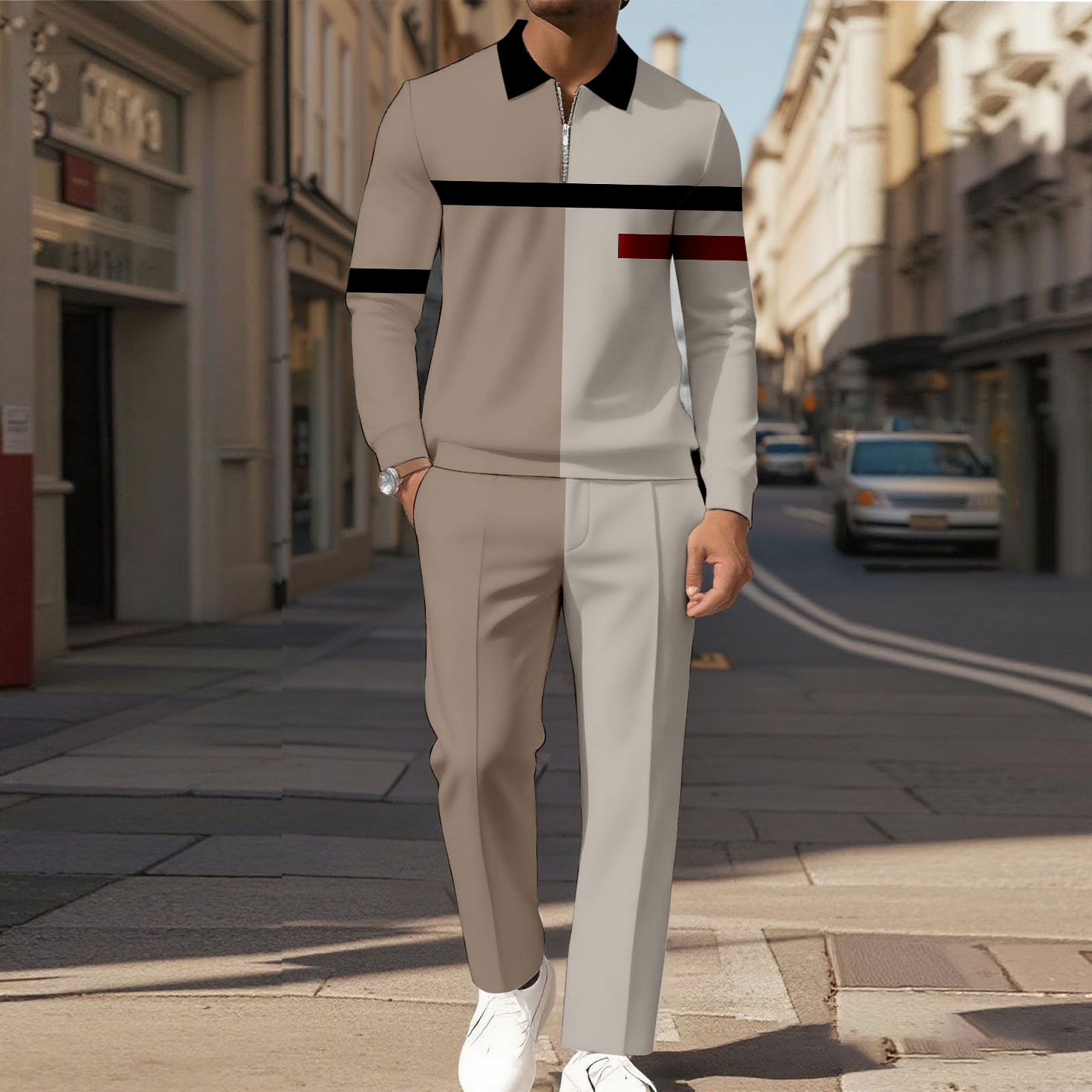 Men's Casual Color Matching Printed Polo-Collar Zipper Long Sleeved Trousers Two-Piece Set