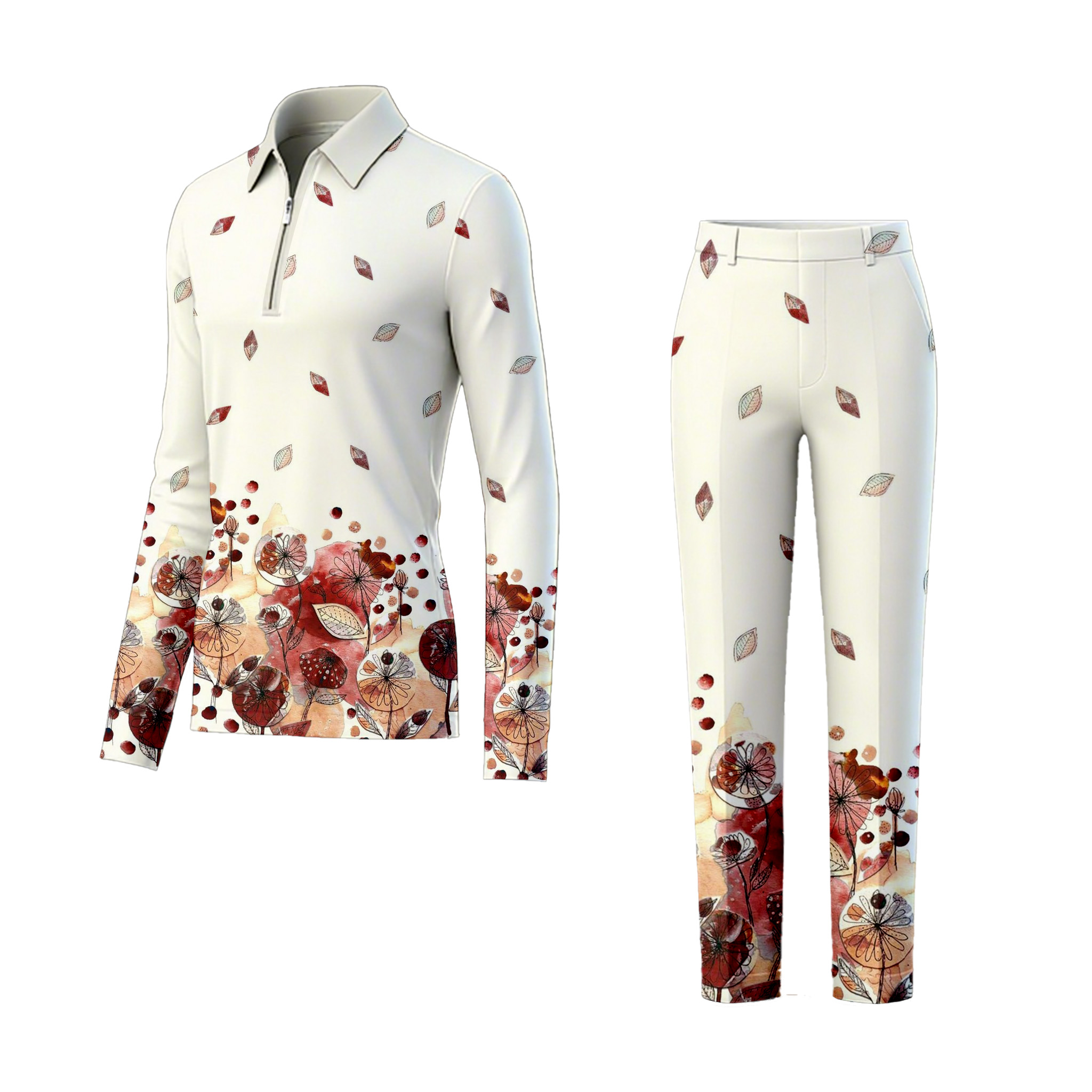 Men's Casual Color Matching Printed Polo-Collar Zipper Long Sleeved Trousers Two-Piece Set