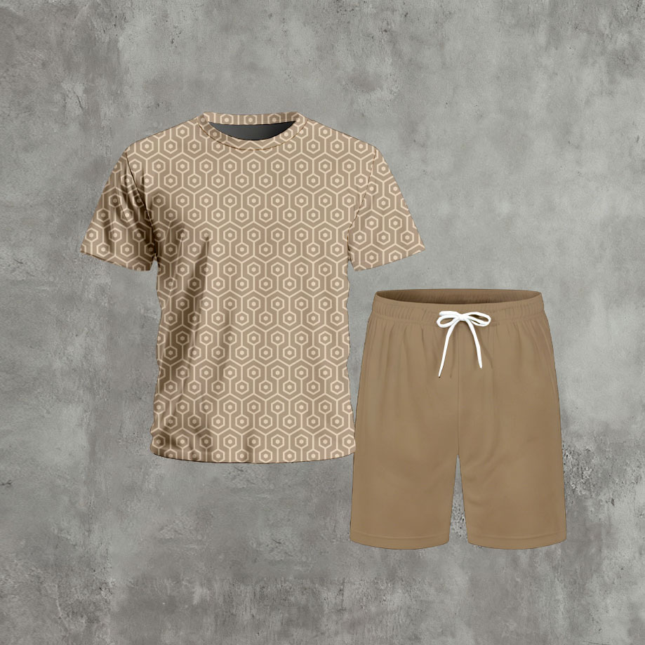 Men's Casual Khaki Color Matching Geometric Printed Round Neck Short Sleeved & Shorts Two-Piece Set