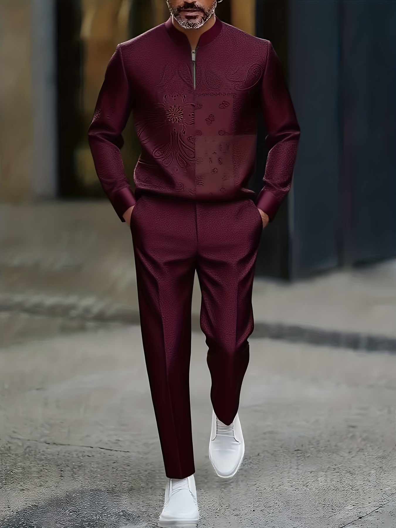 Men's Casual Color Matching Printed Round-Neck Zipper Long Sleeved Trousers Two-Piece Set