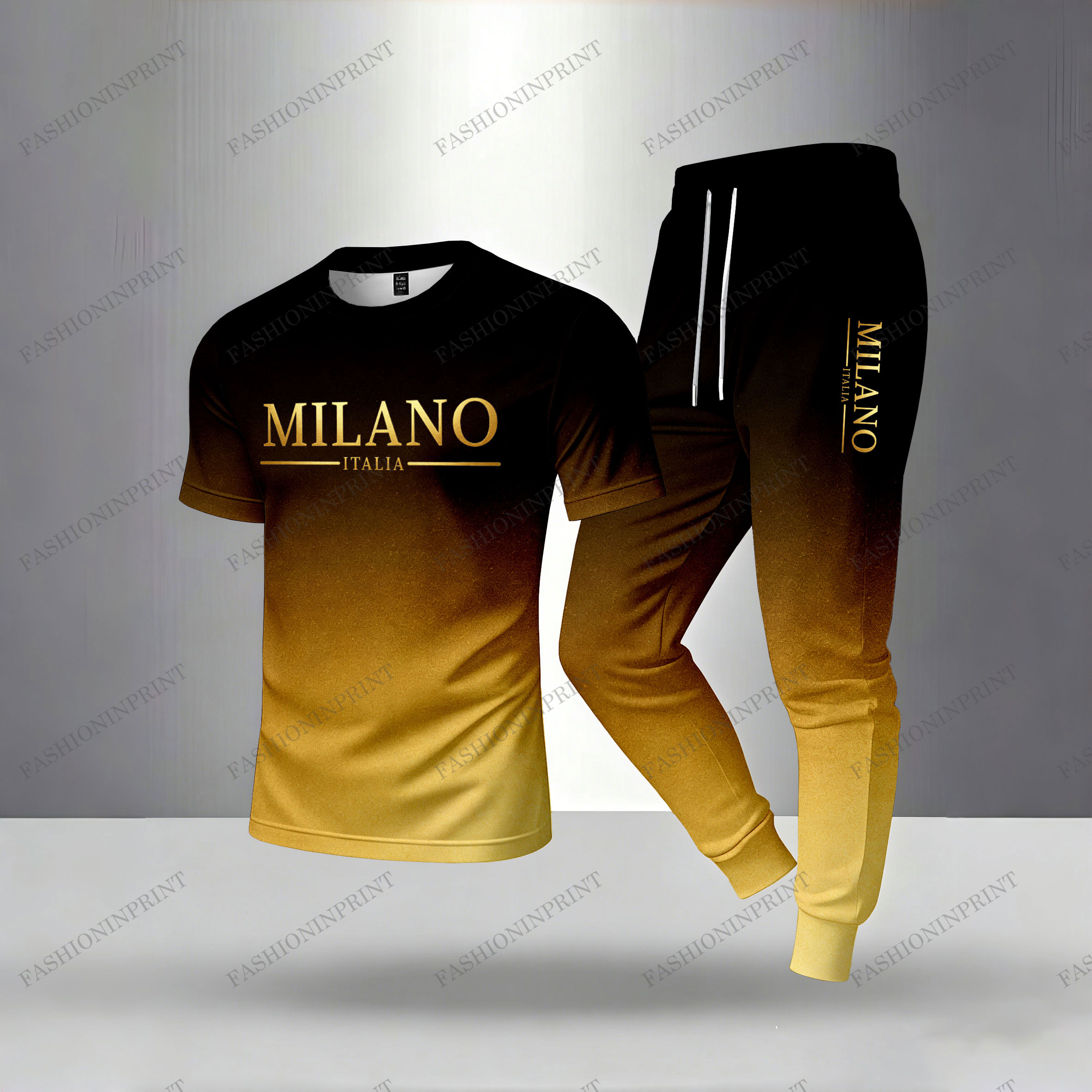 Men's Casual Black & Yellow Color Matching Gradient Printed Short Sleeved T-Shirt & Trousers Two-Piece Set